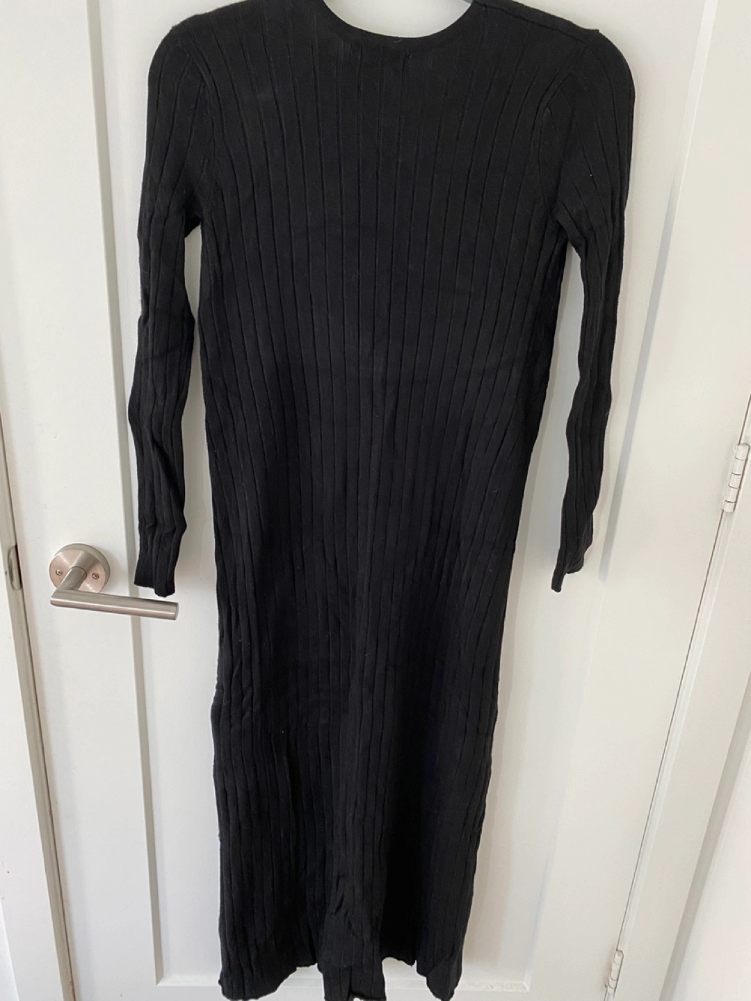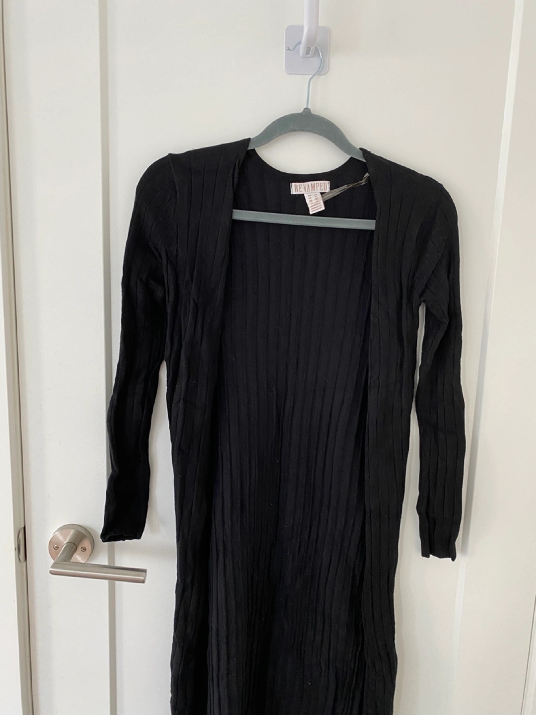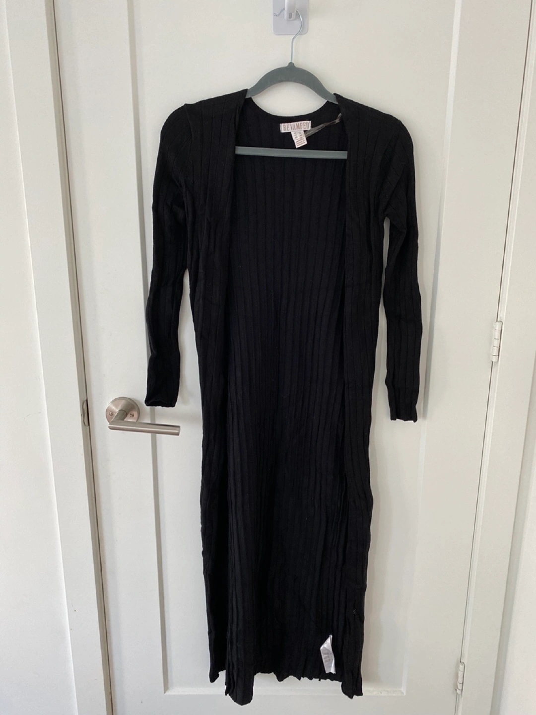 Long black ribbed knit cardigan with an Open front and three-quarter sleeves.