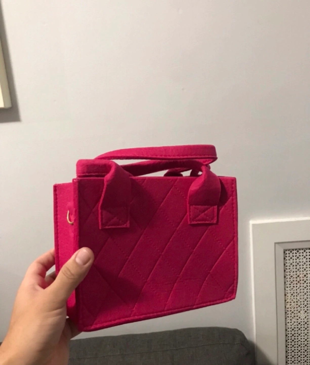 144Adorable mini handbag. Perfect for carrying essentials. Pink felt material. Quilted design. Top handles. Small size.