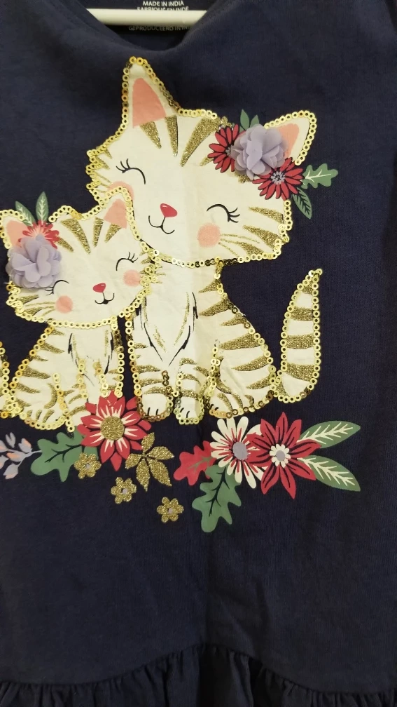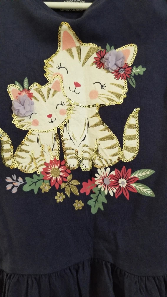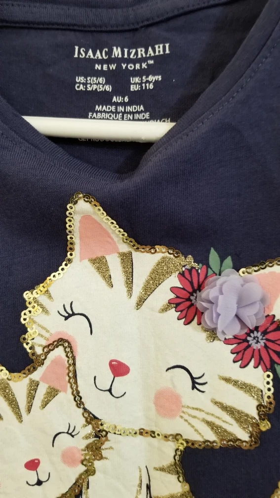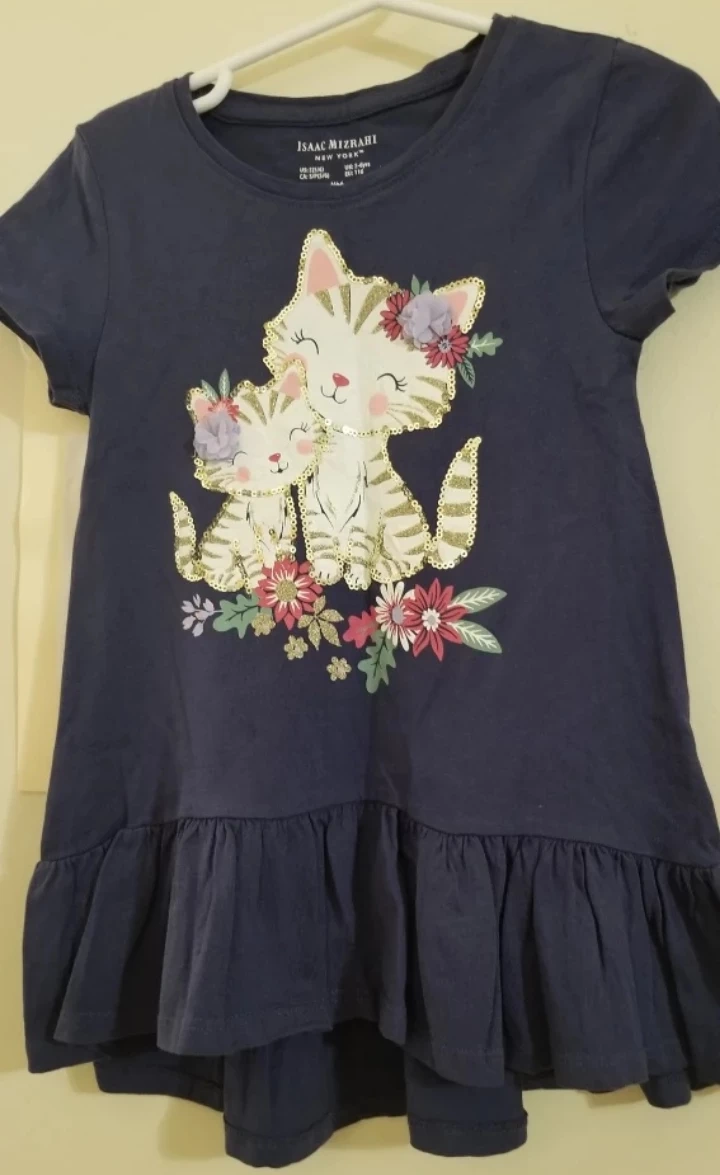 1000+Adorable navy blue t-shirt. Features two cute cats with flowers. Size 5/6. Short sleeves, ruffled hem. Not used.