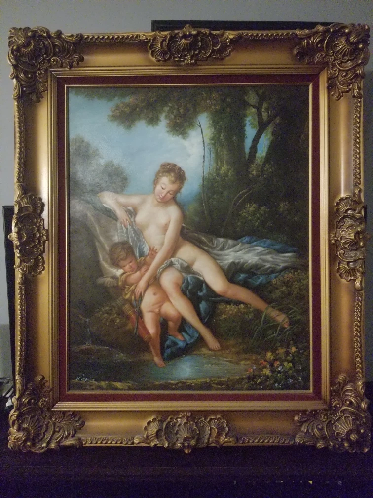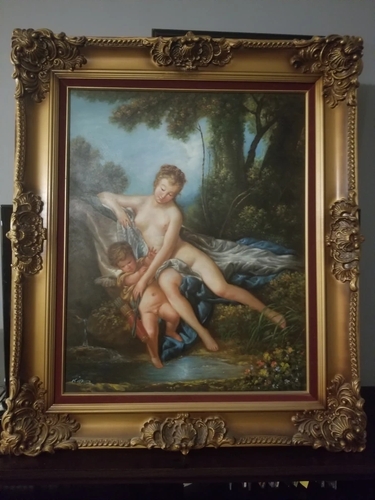 Beautiful oil painting in a large, ornate gold frame. Depicts a woman and cherub by a stream. A lovely piece for a home or gallery.
