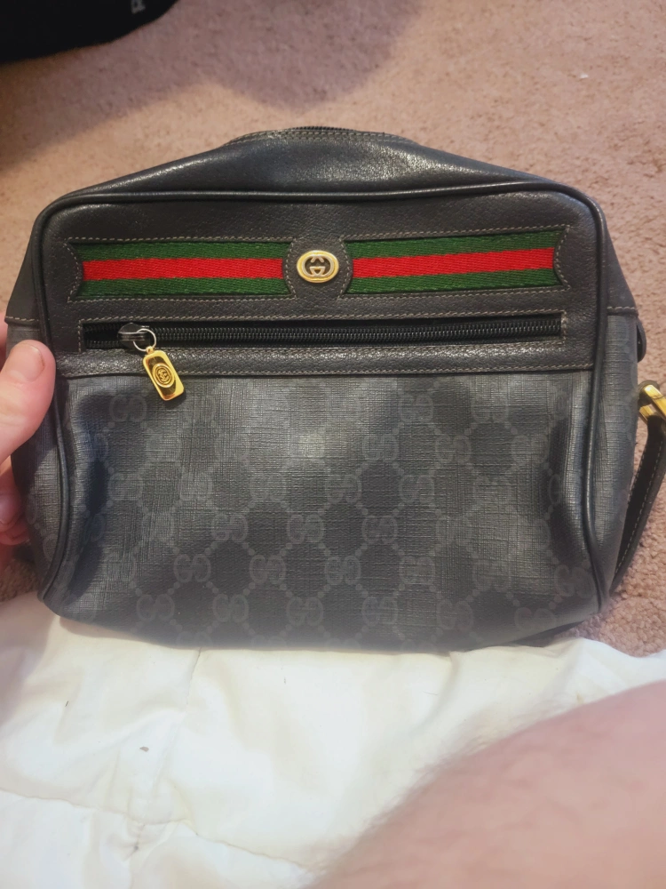 Pre-owned Gucci bag. Classic GG monogram canvas. Features a red and green web stripe. Gold-toned hardware. Zip closure. Interior label shows "Gucci Luxury Collection Made in Italy". vintage so it's not perfect condition but no rips or tears inside material is a bit faded am also open top trades