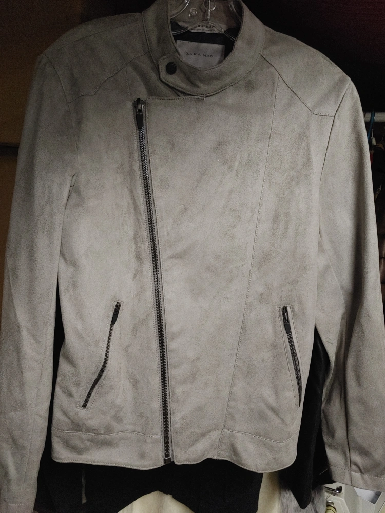 Men's grey suede jacket. Asymmetrical zipper. Long sleeves. Multiple pockets. Good condition.