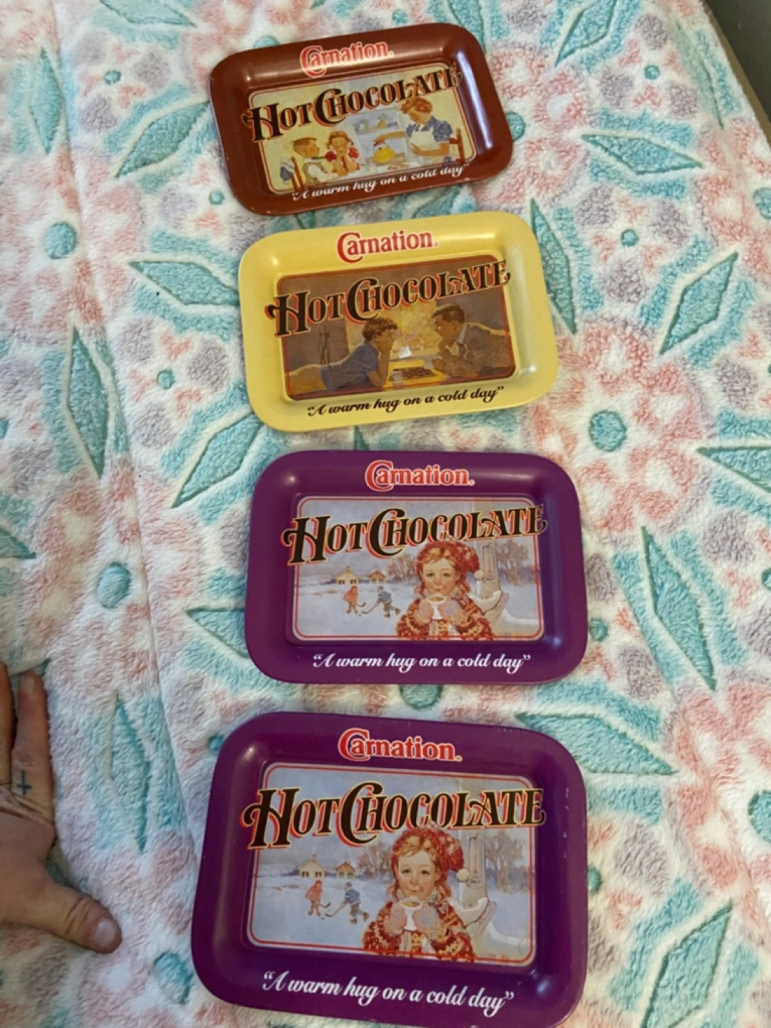 74Four collectible metal trays. Each features vintage Carnation Hot Chocolate artwork. A warm hug on a cold day. Asking $ 20 for the lot
