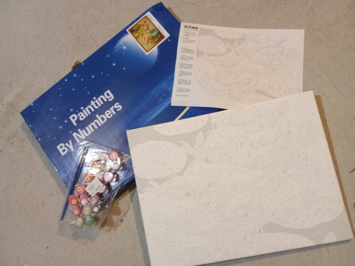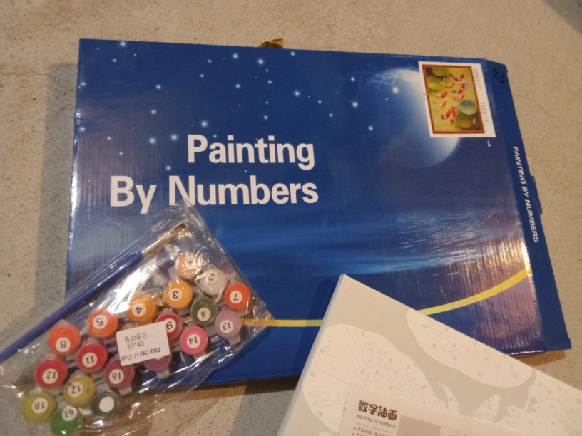 New paint by numbers kit. Features a koi fish design. Includes canvas, paints, and brushes. Great for beginners or experienced artists.