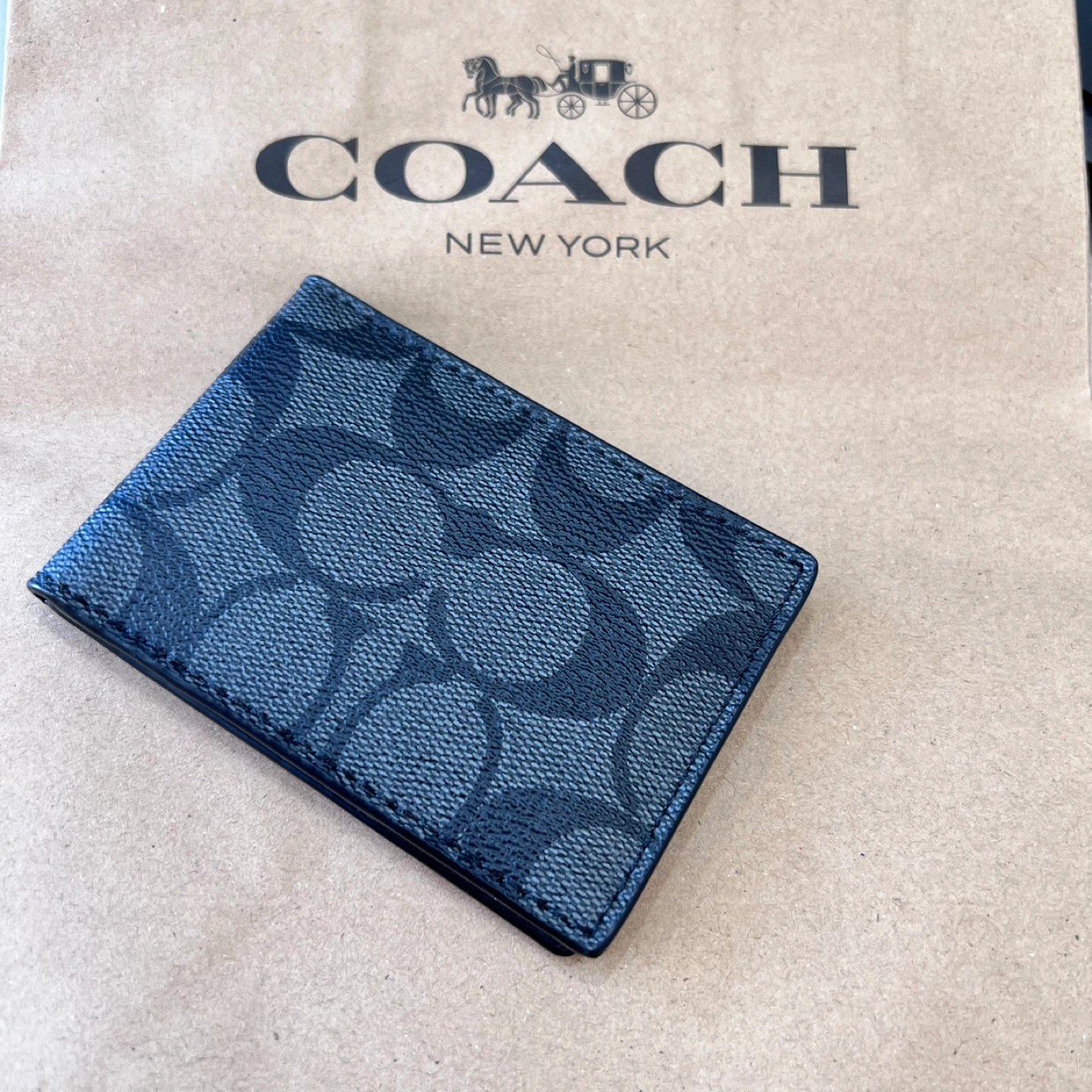 Slim leather card holder. Features a window ID slot and multiple card slots. Compact design, ideal for everyday use. Black leather exterior. Coach logo present.