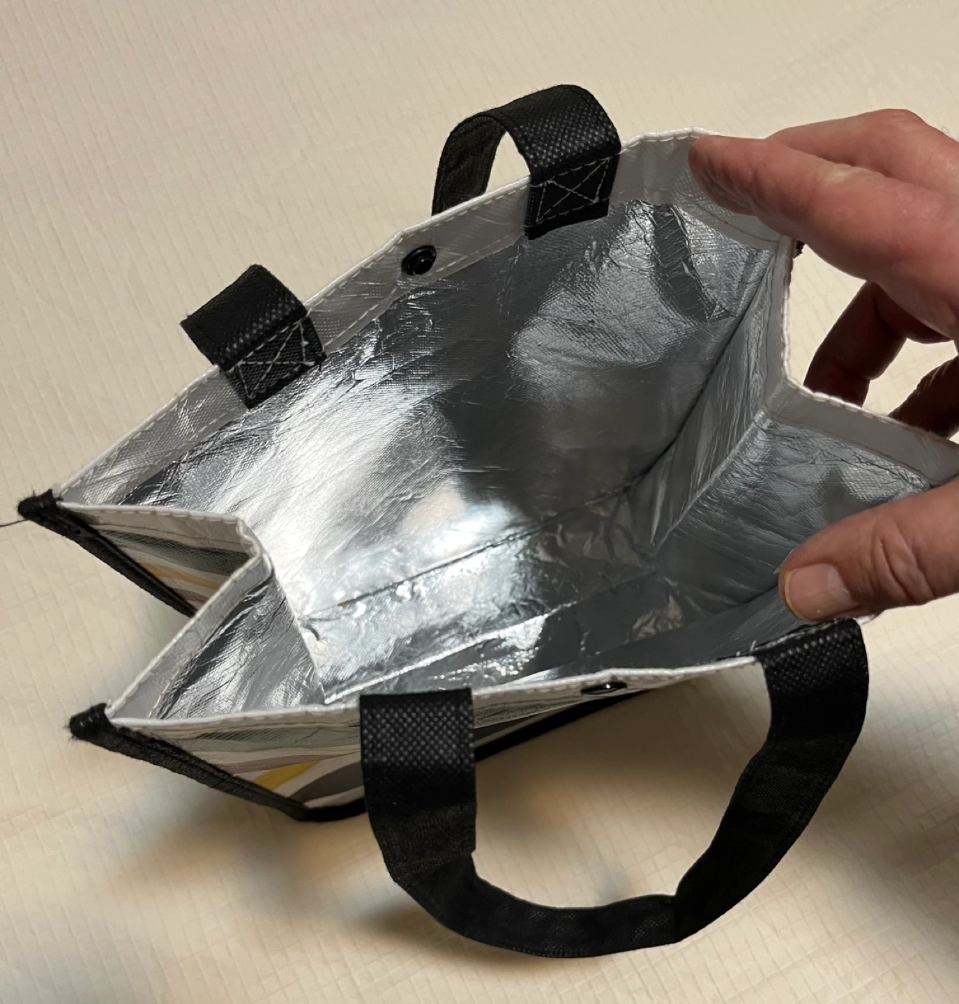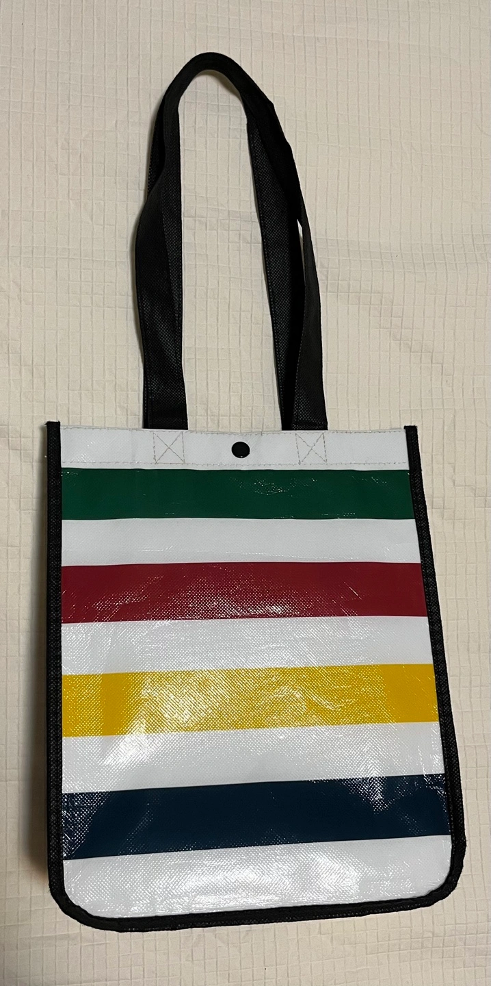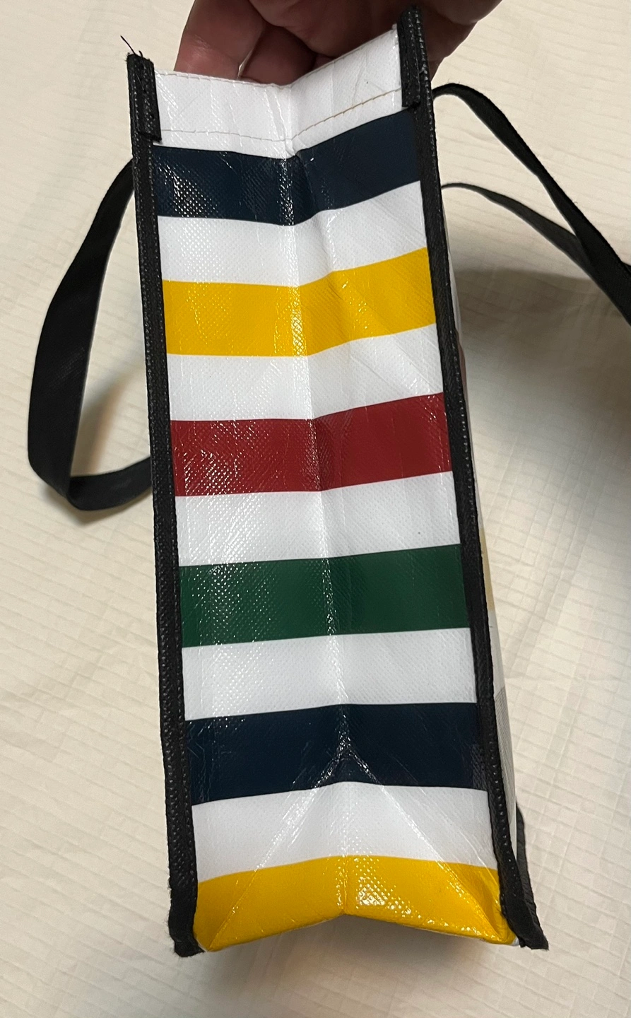 Insulated tote bag. Features a Hudson's Bay Point Blanket print. Black straps. Silver insulated interior. Perfect as a lunch bag.