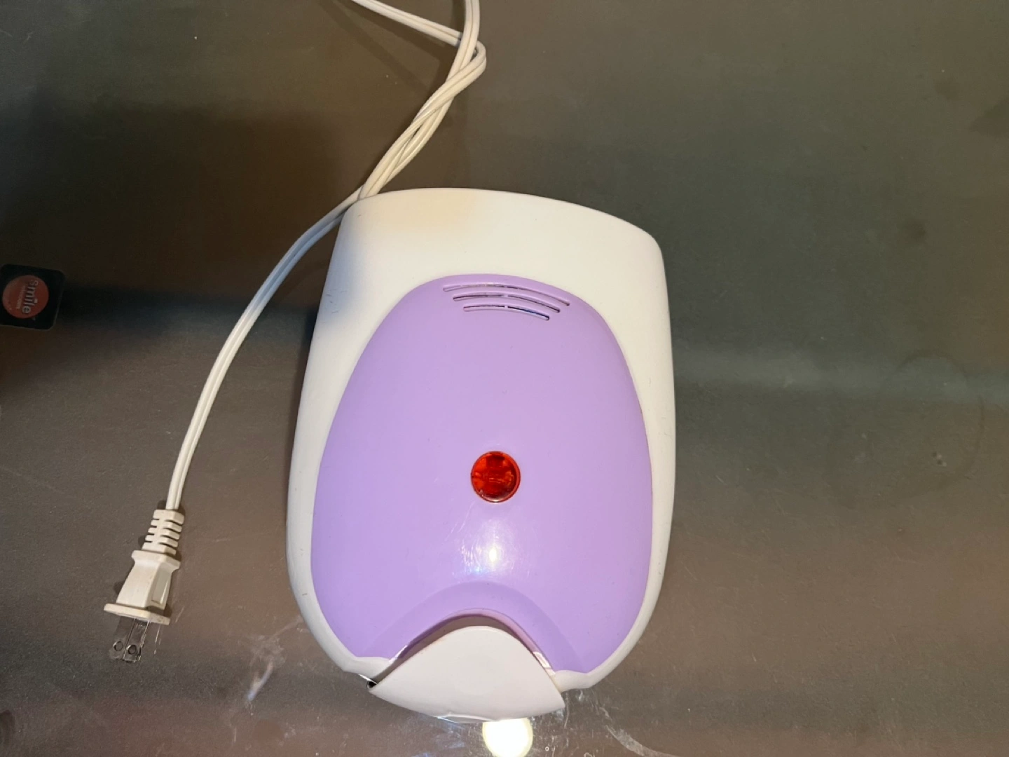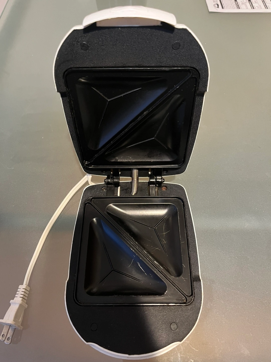 Portable sandwich maker, makes two triangles. Used epilator, purple and white. Both require a standard wall plug.