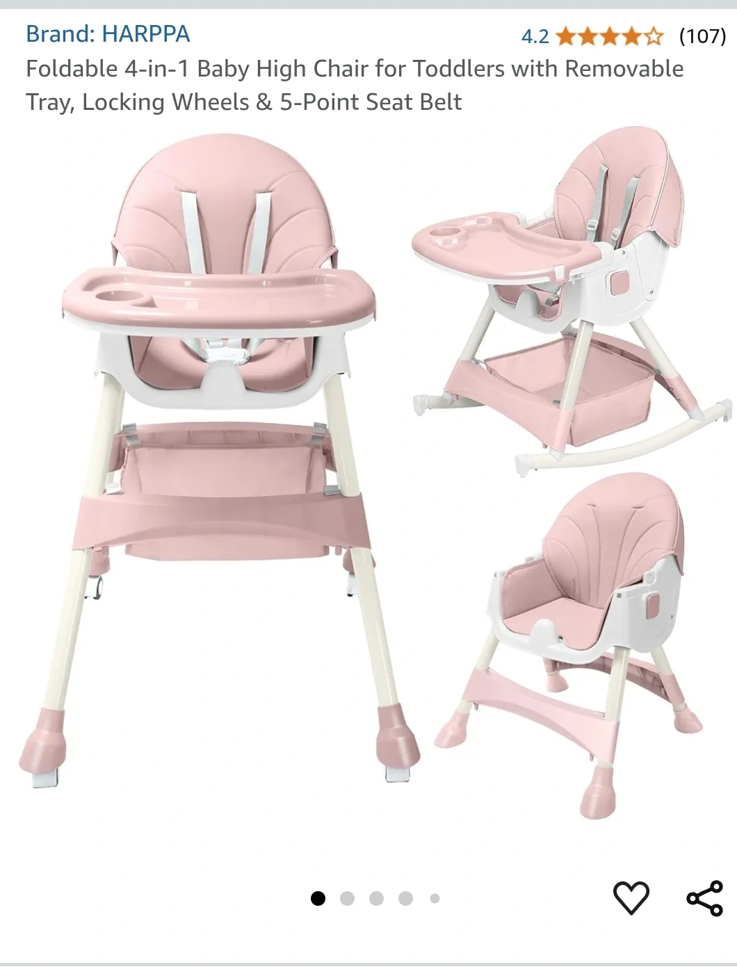 Foldable high chair. Removable tray. Locking wheels. 5-point seat belt. Good condition.