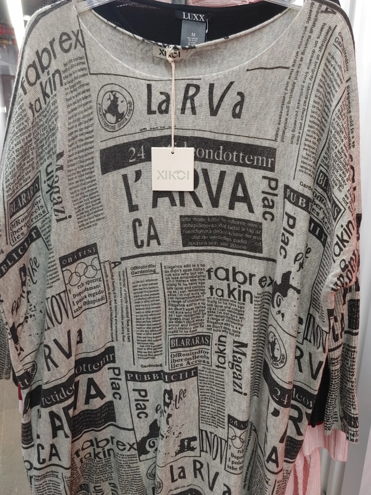 31Women's long-sleeved knit top. Features a newspaper print design. Relaxed fit. Size Medium.