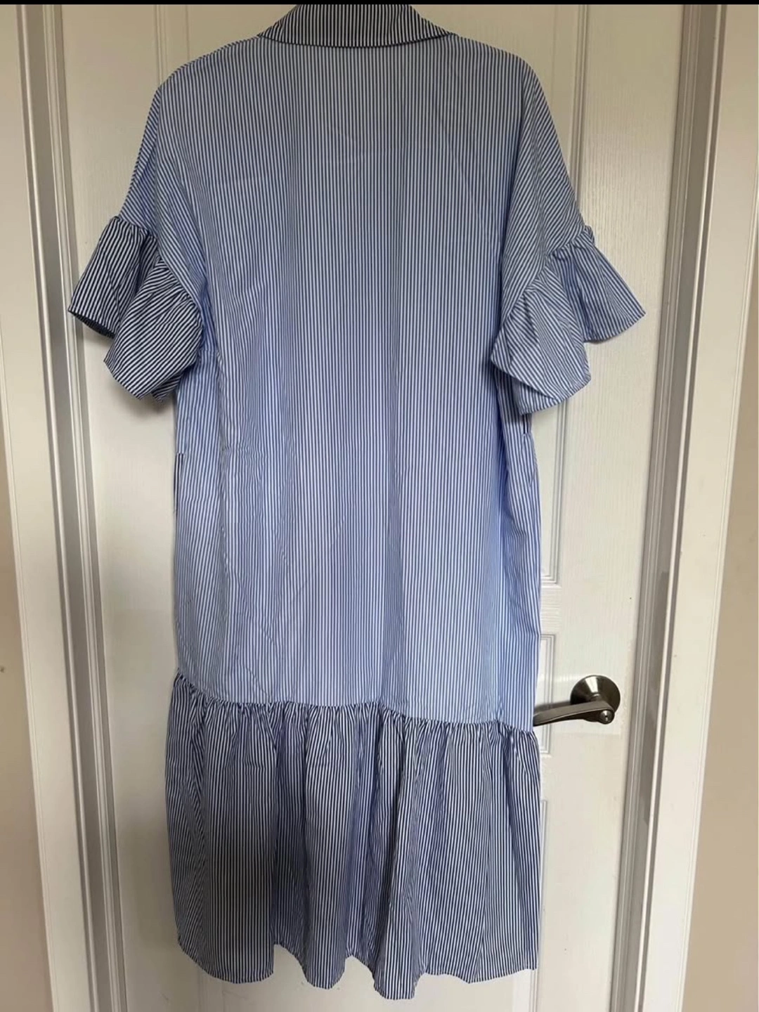 Cute blue and white striped shirt dress. Short sleeves, collared neckline, button closure. Tiered skirt. Relaxed fit.