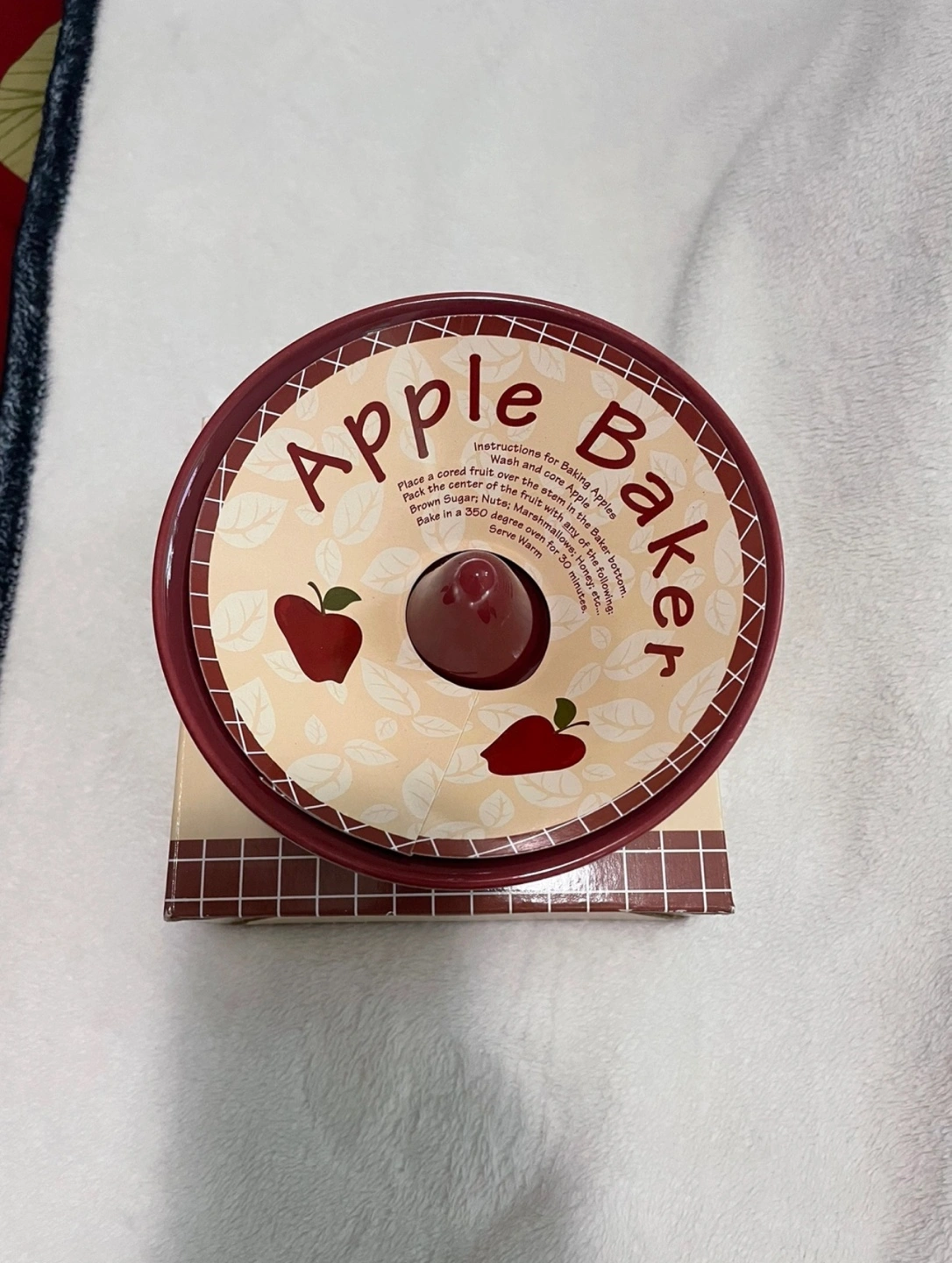 Red ceramic apple baker. Includes instructions for baking apples. Great for baking apples with various fillings. New with the box