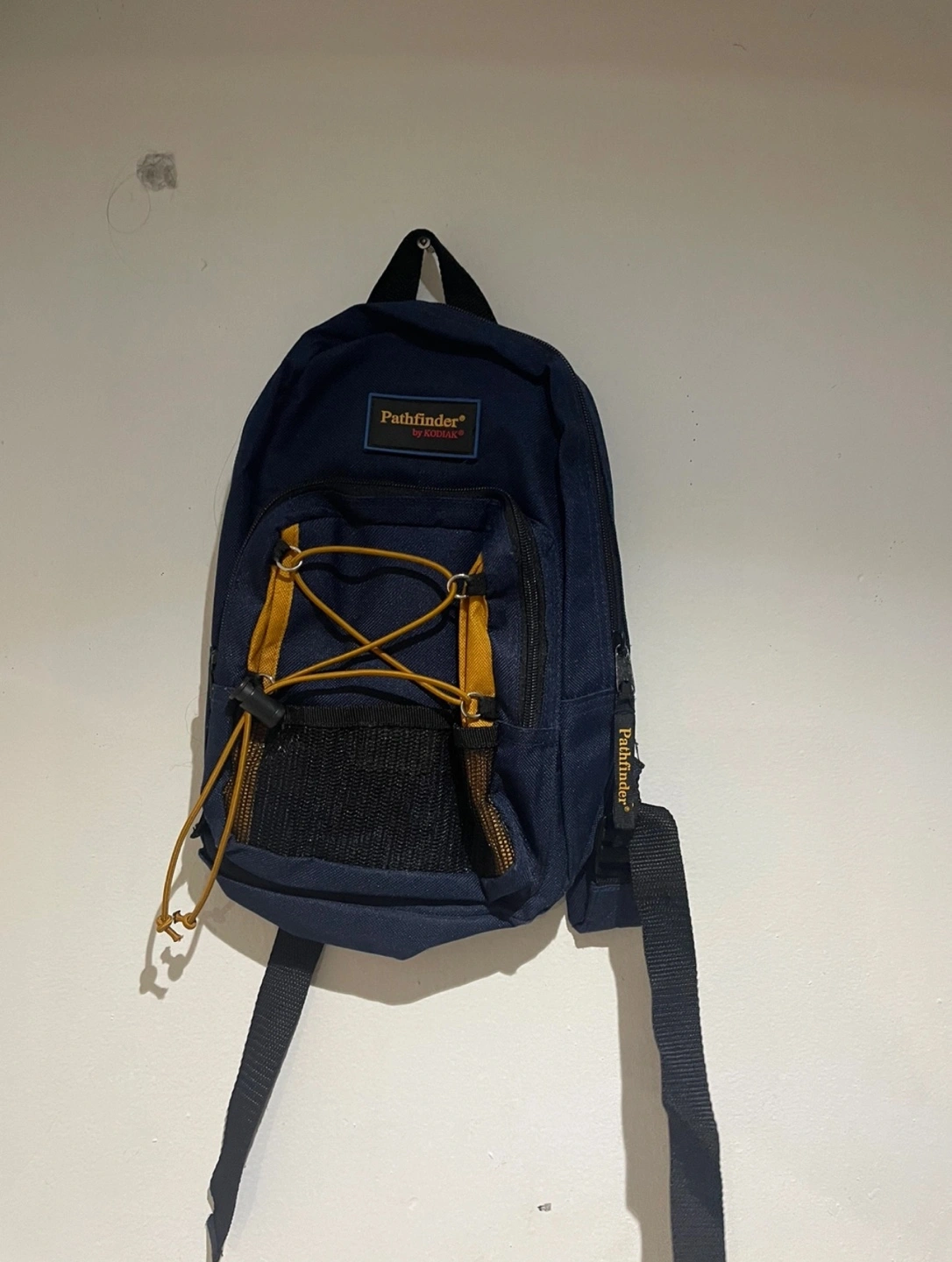 Small navy blue backpack. Features adjustable straps, zippered compartments, and drawstring closure. Excellent for everyday use or travel. Small