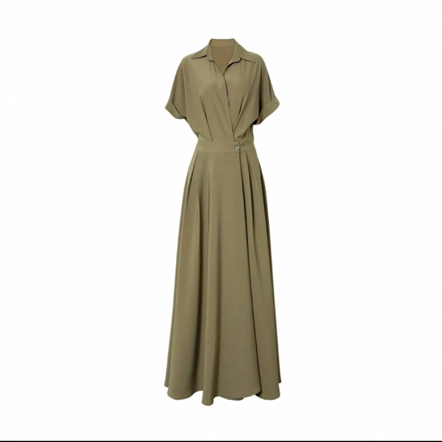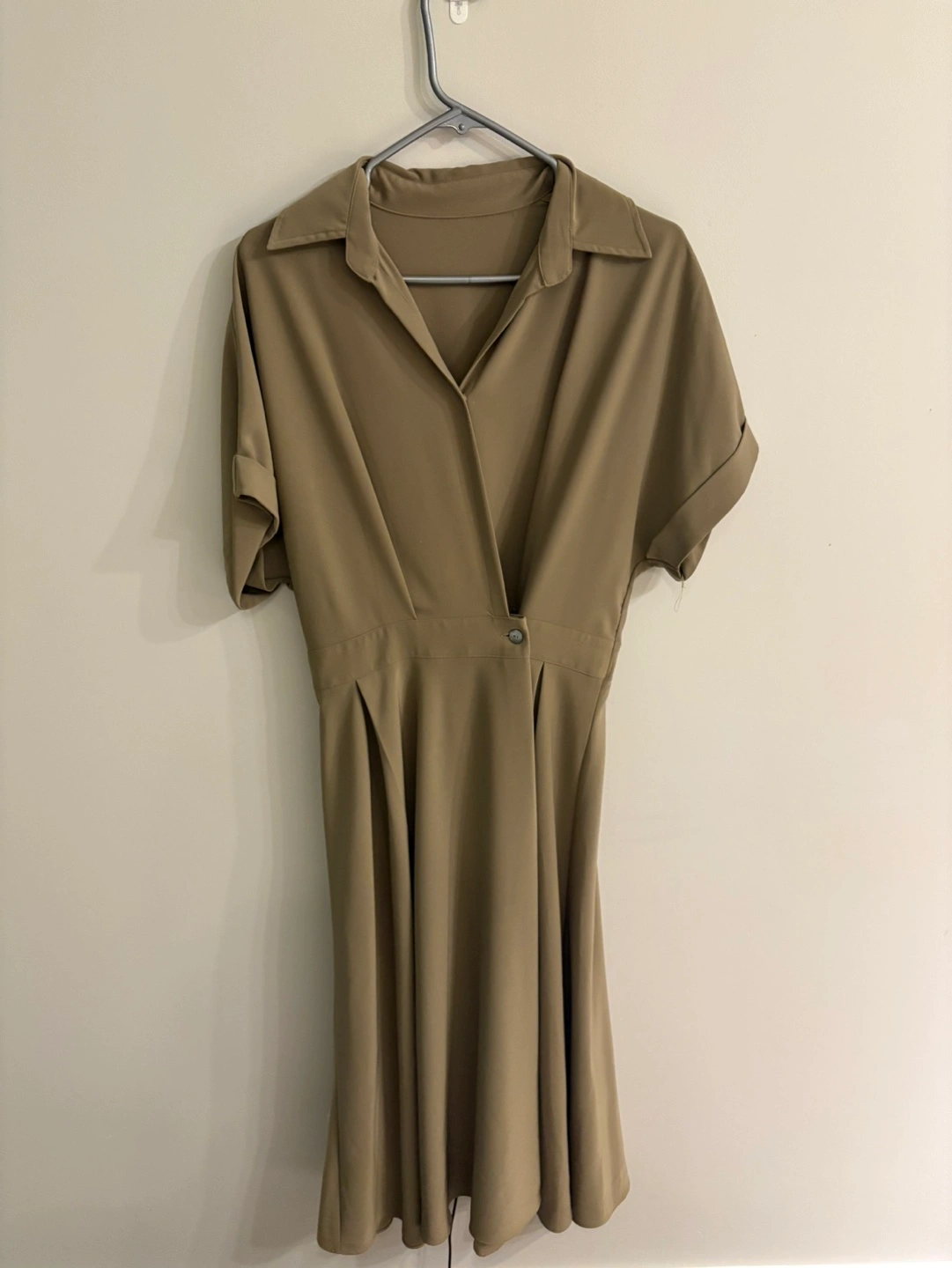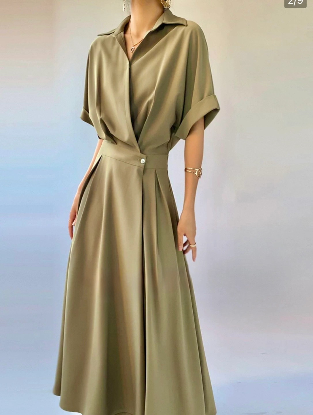 Flowy midi dress. Short sleeves, collared neckline. Wrap-style bodice. Elasticated waist. Perfect for a casual or semi-formal occasion.