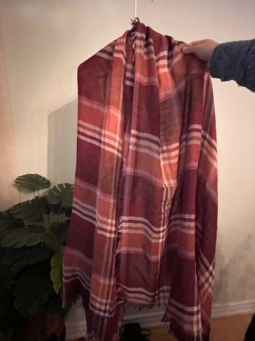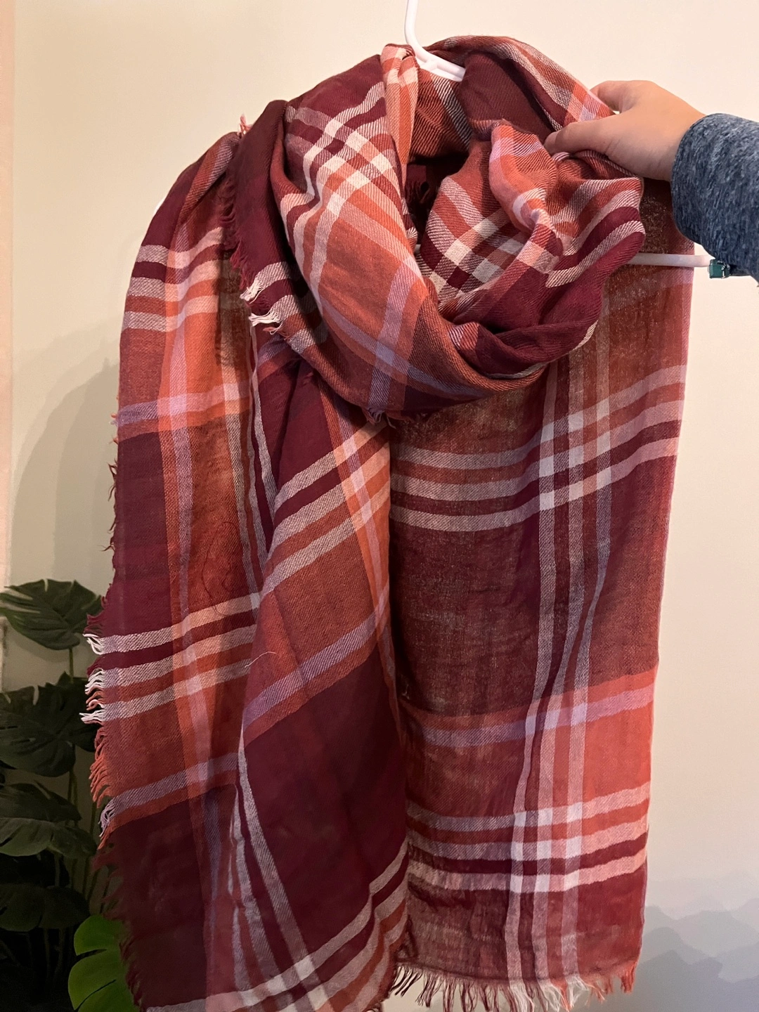 Gorgeous burgundy, orange and cream plaid scarf. Soft and lightweight fabric. Frayed edges. Perfect for fall.