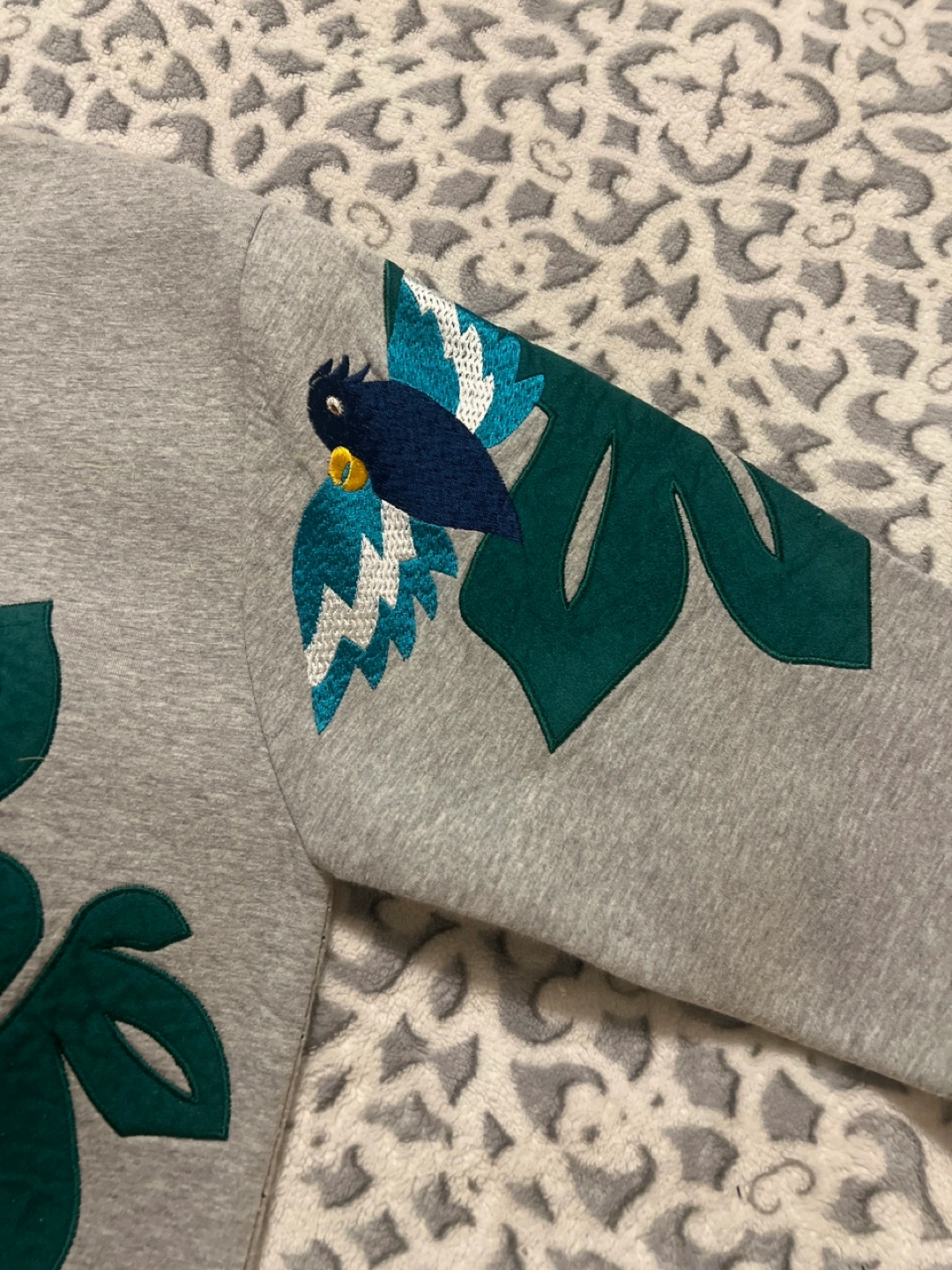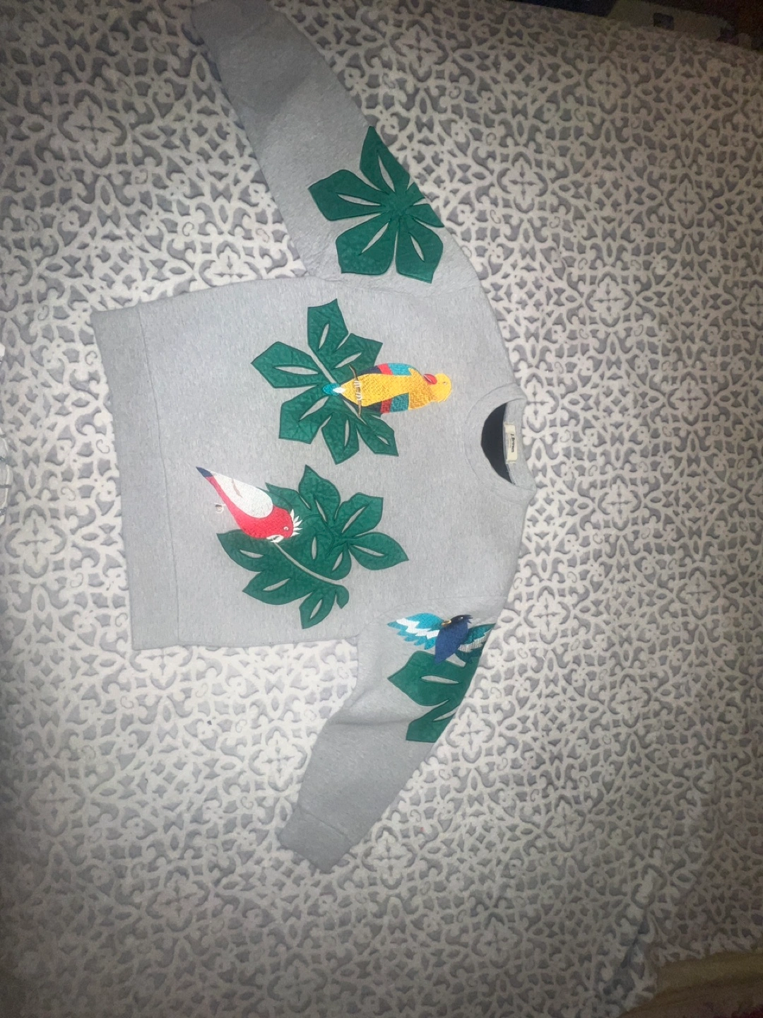 J.Brown Grey Parrot Sweatshirt small size.Grey sweatshirt with embroidered parrots and tropical leaves. Made in Korea. Long sleeves, crew neck.