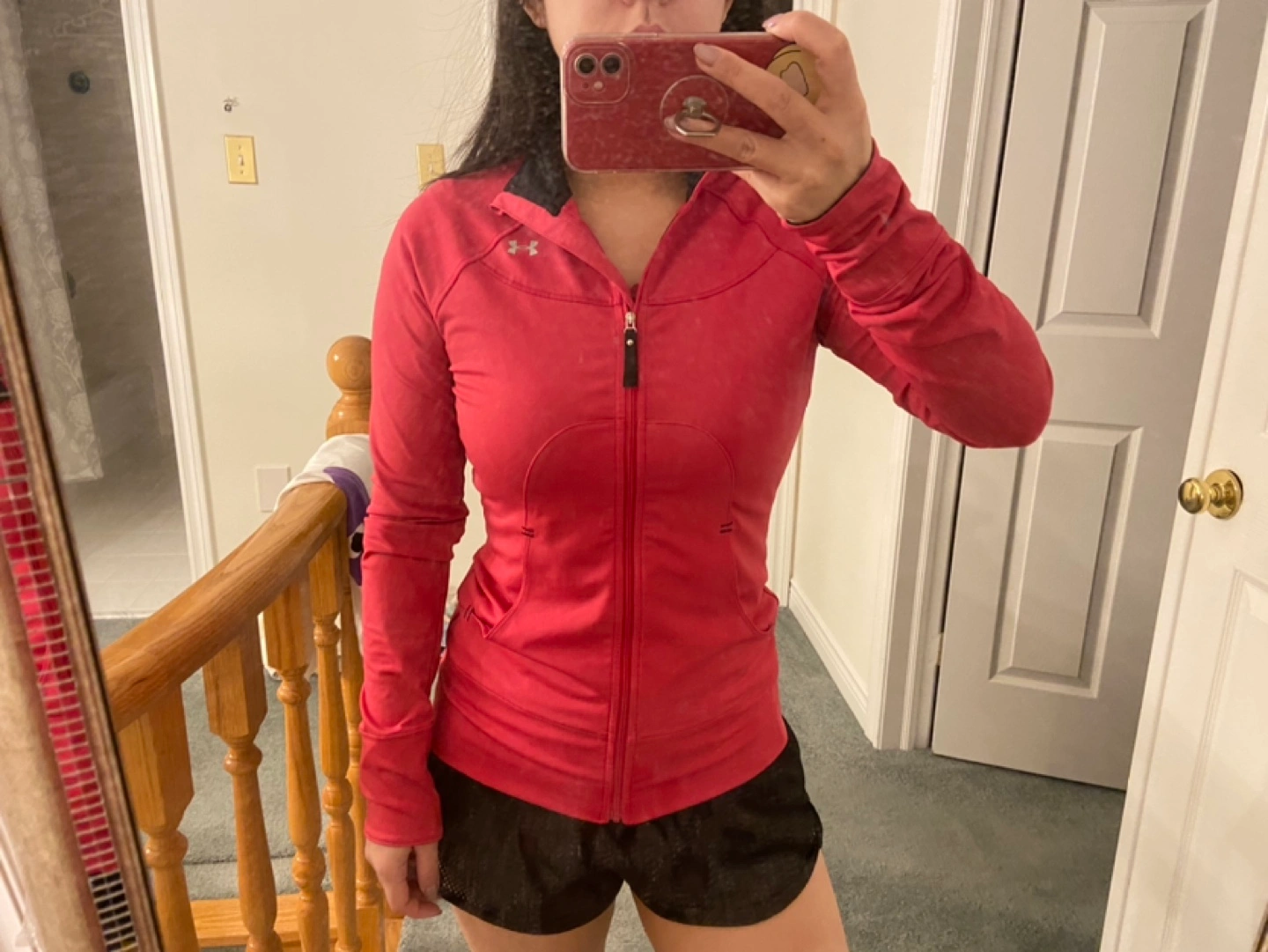 Women's Under Armour zip-up jacket. Pink colour. Long sleeves. Small pockets. Great for workouts or casual wear. Size XS but fits S-M as well. Barely worn, like new