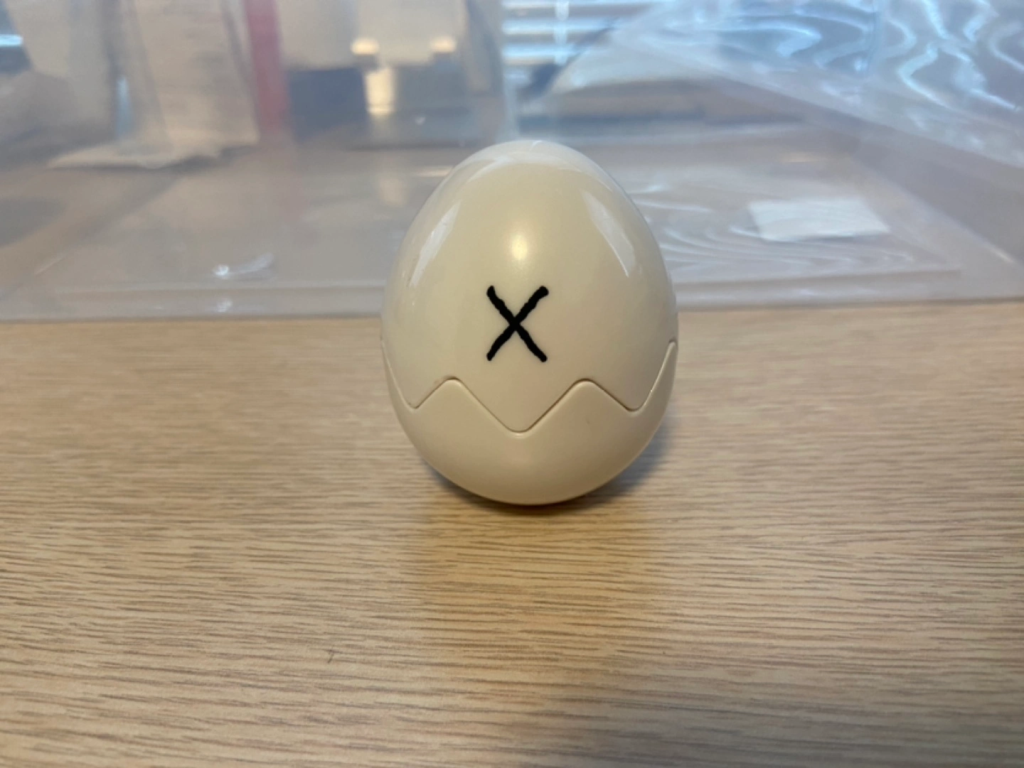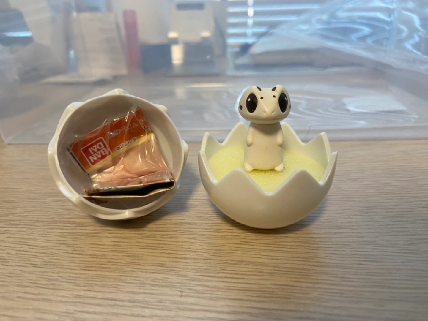 Cute Tamagotchi On hatching egg toy. White plastic egg, opens to reveal a small snow leopard gecko figure ring. Gachapon item
