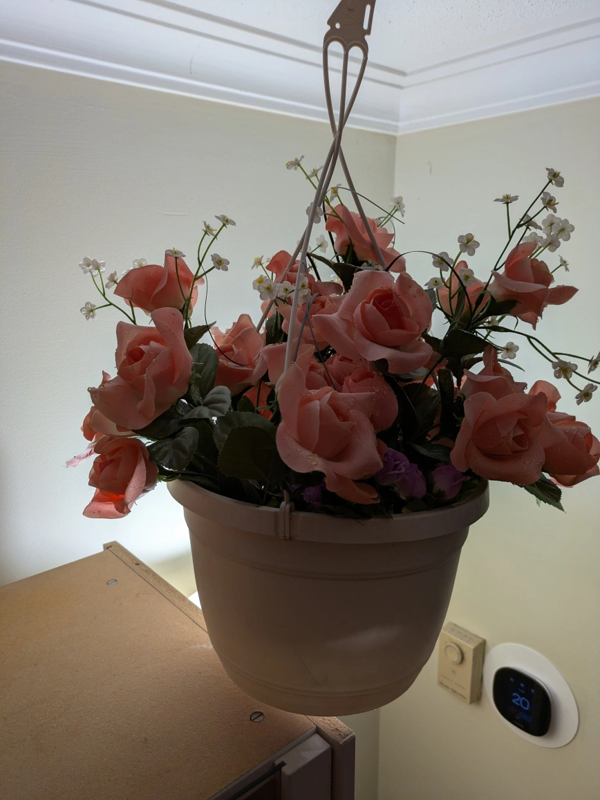 Artificial rose arrangement in a hanging planter. Peach-coloured roses and small white flowers. Cream-coloured plastic pot. Great for home décor.