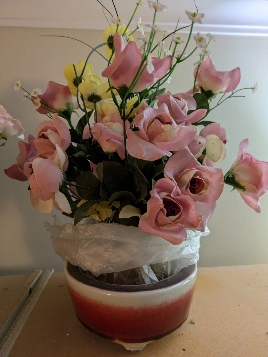 Lovely artificial flower arrangement. Pink and white roses with smaller white flowers. Pot is red and white, oval shaped. Great for home decor.