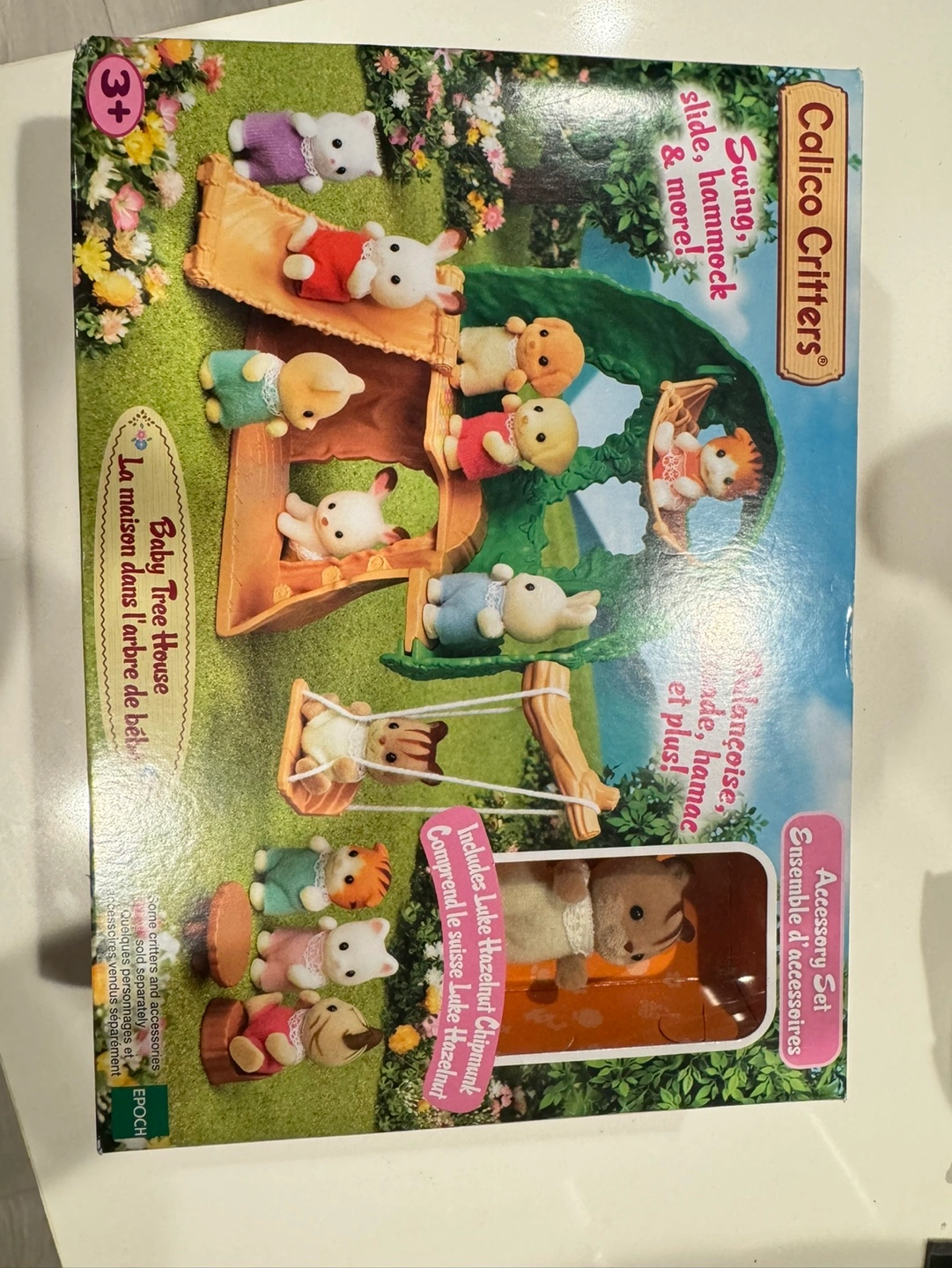 Calico Critters playset. Includes baby tree house with swing and hammock. Also includes Hopsocotch Rabbit family. Adorable collectible figurines. Great for imaginative play.