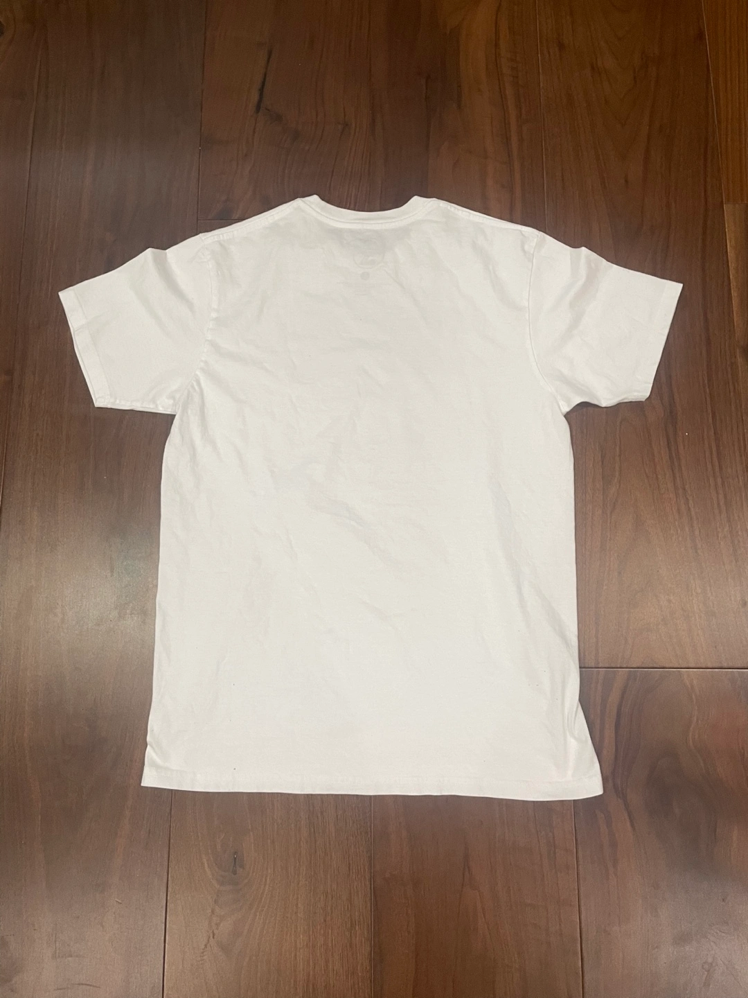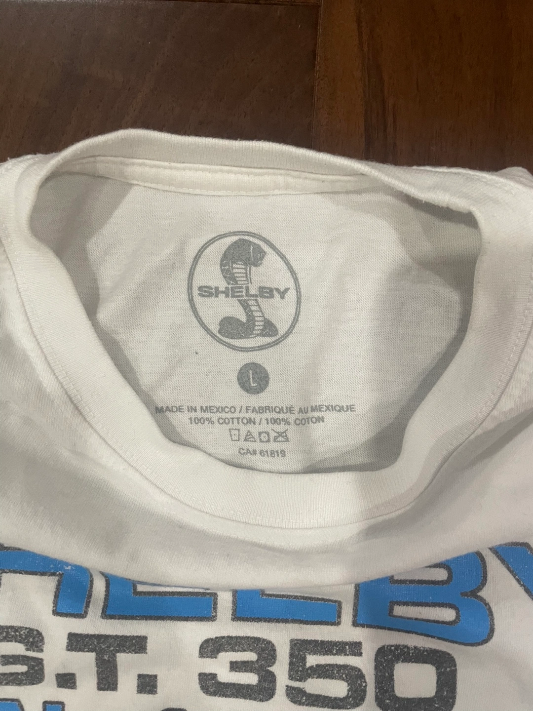 Men's size large white t-shirt. Features a graphic of a Shelby GT350 and text detailing the car's specifications. Made in Mexico, 100% cotton.