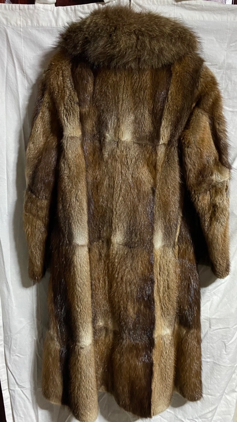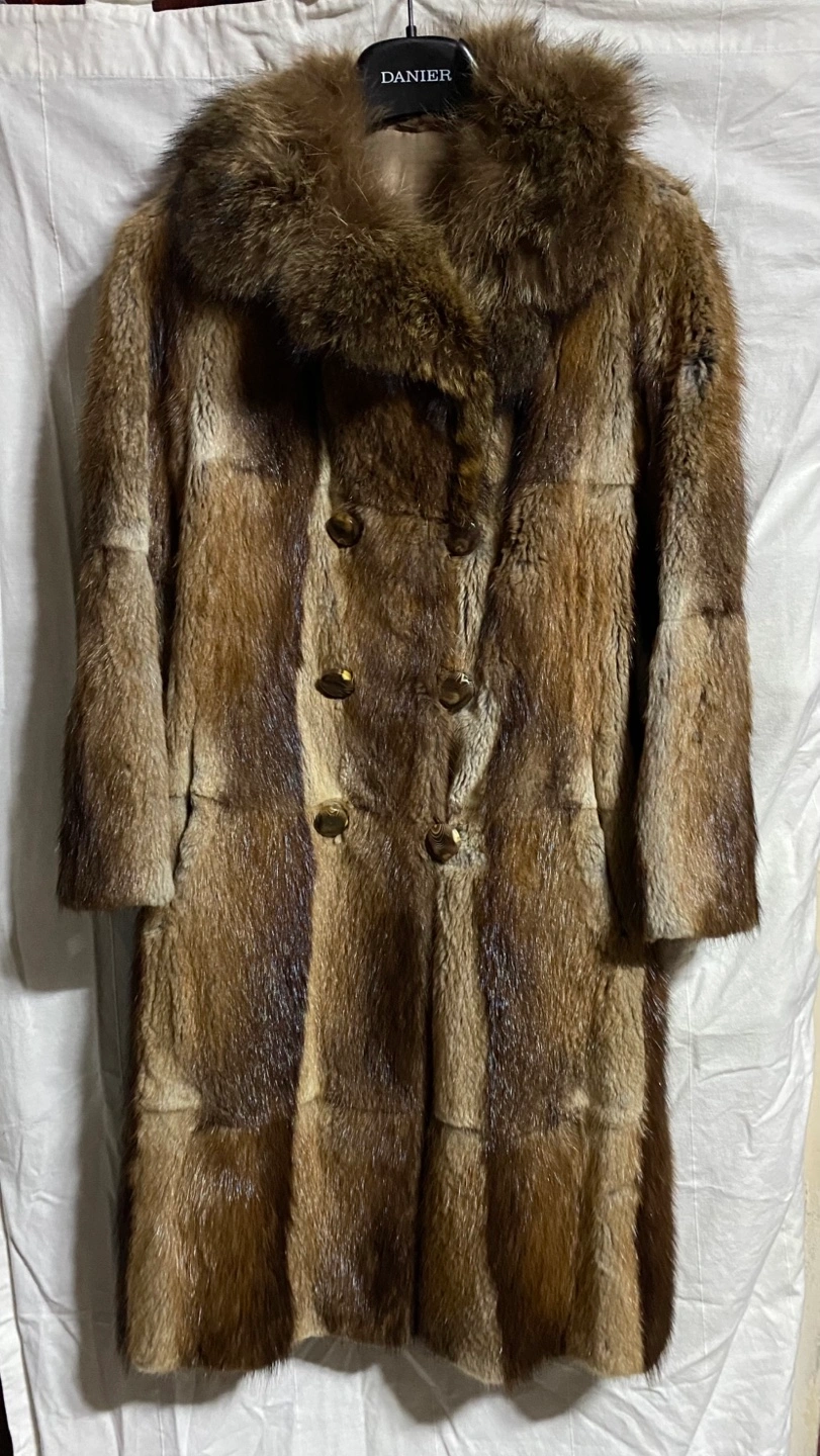 Double-breasted design. Features a large collar. Beautiful rich brown tones.