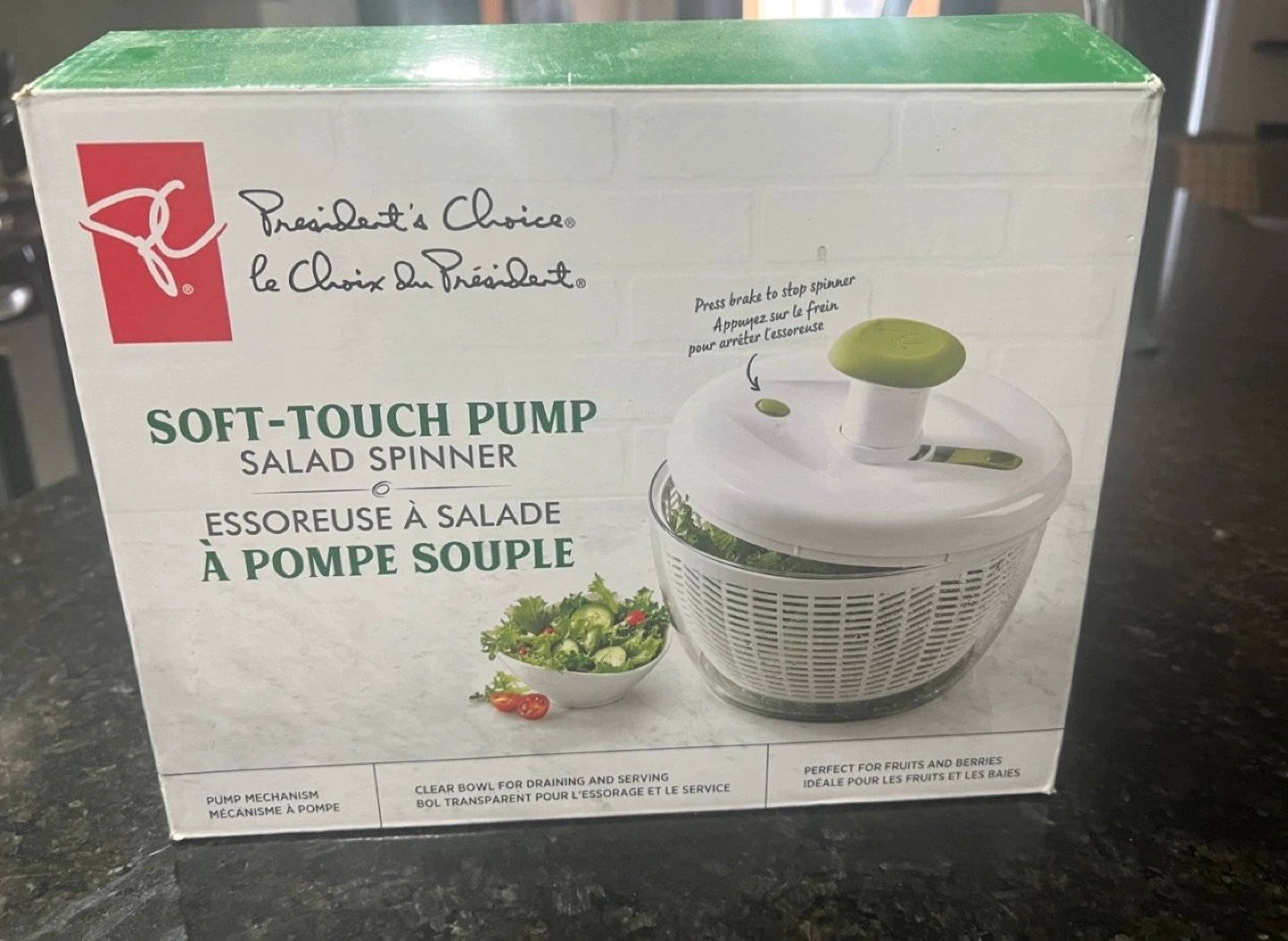 New in box. Soft-touch pump salad spinner. Clear bowl for draining and serving. Perfect for fruits and berries.