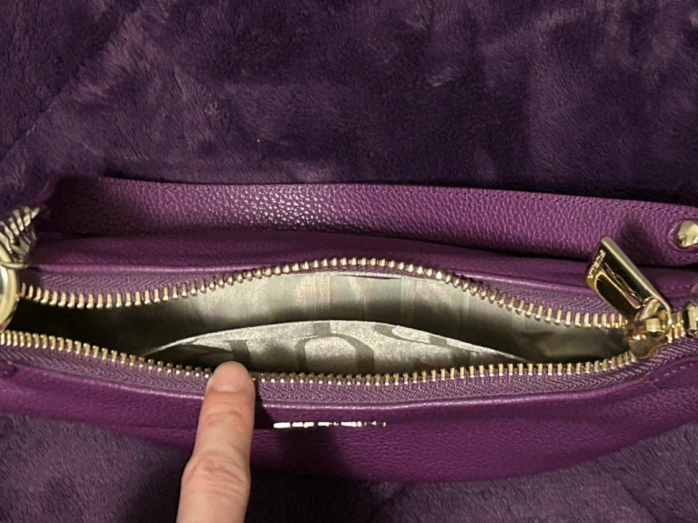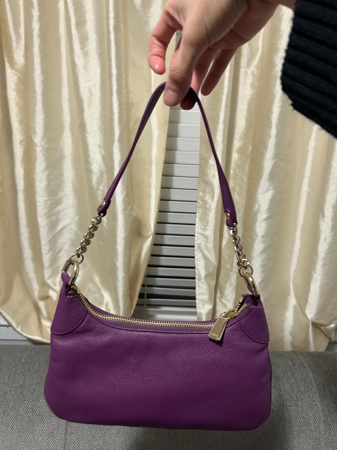 Purple leather handbag. Features a zipper closure and gold-toned hardware. Includes a detachable shoulder strap. Small interior pocket. 100% Authentic.
