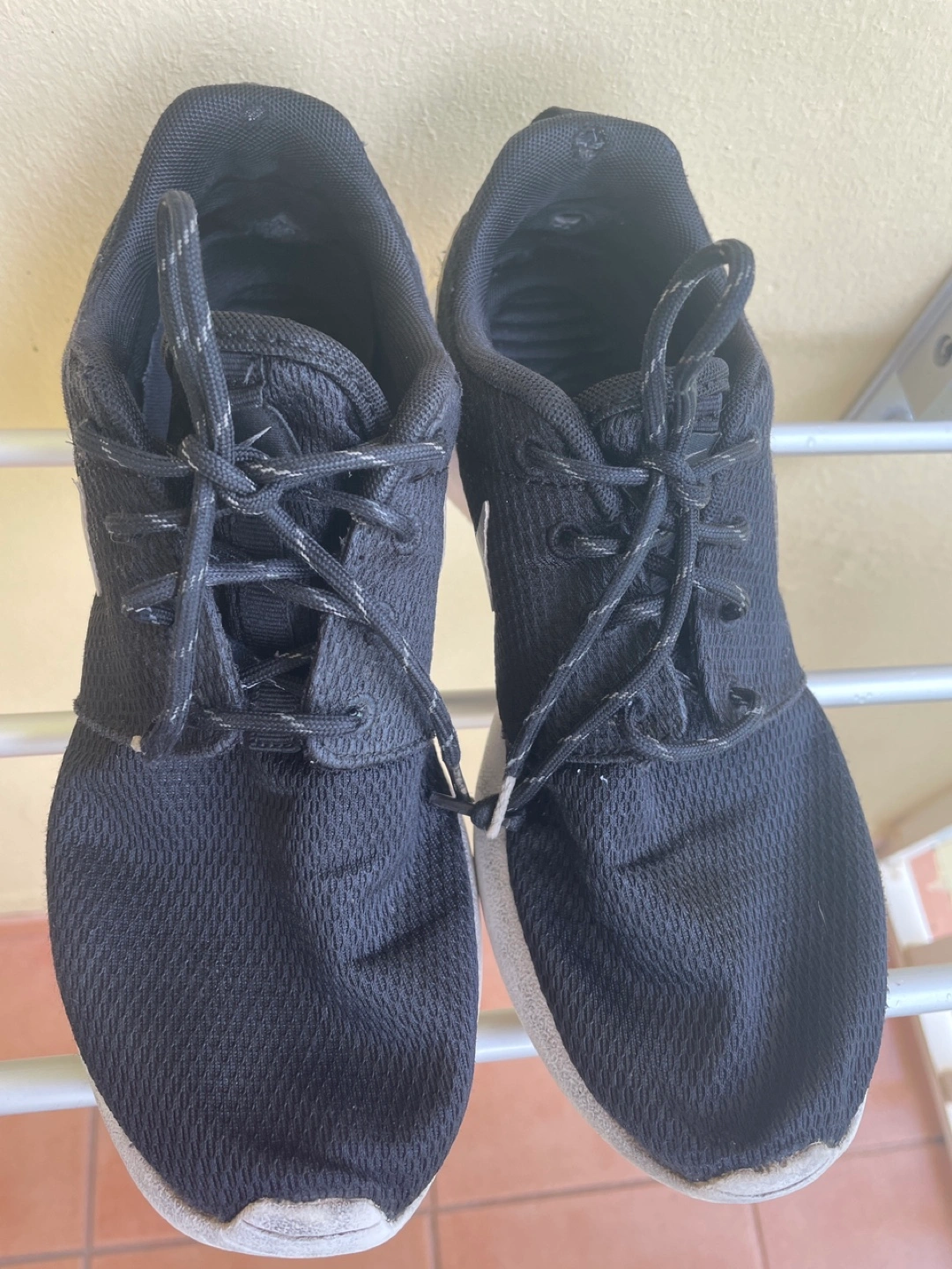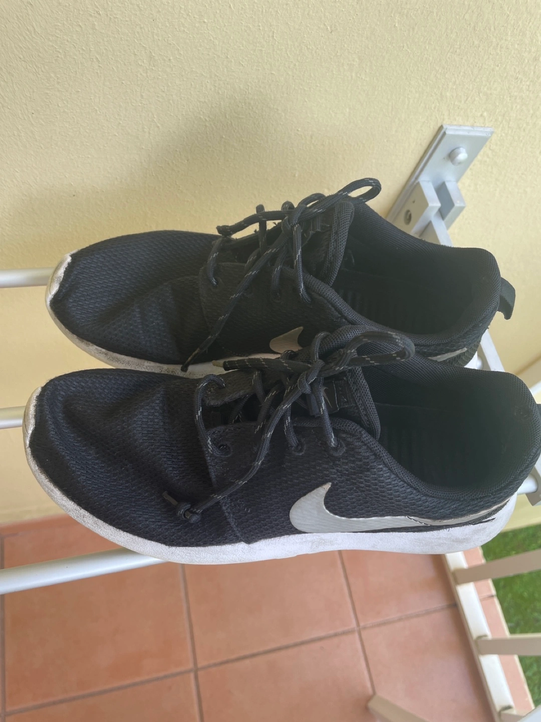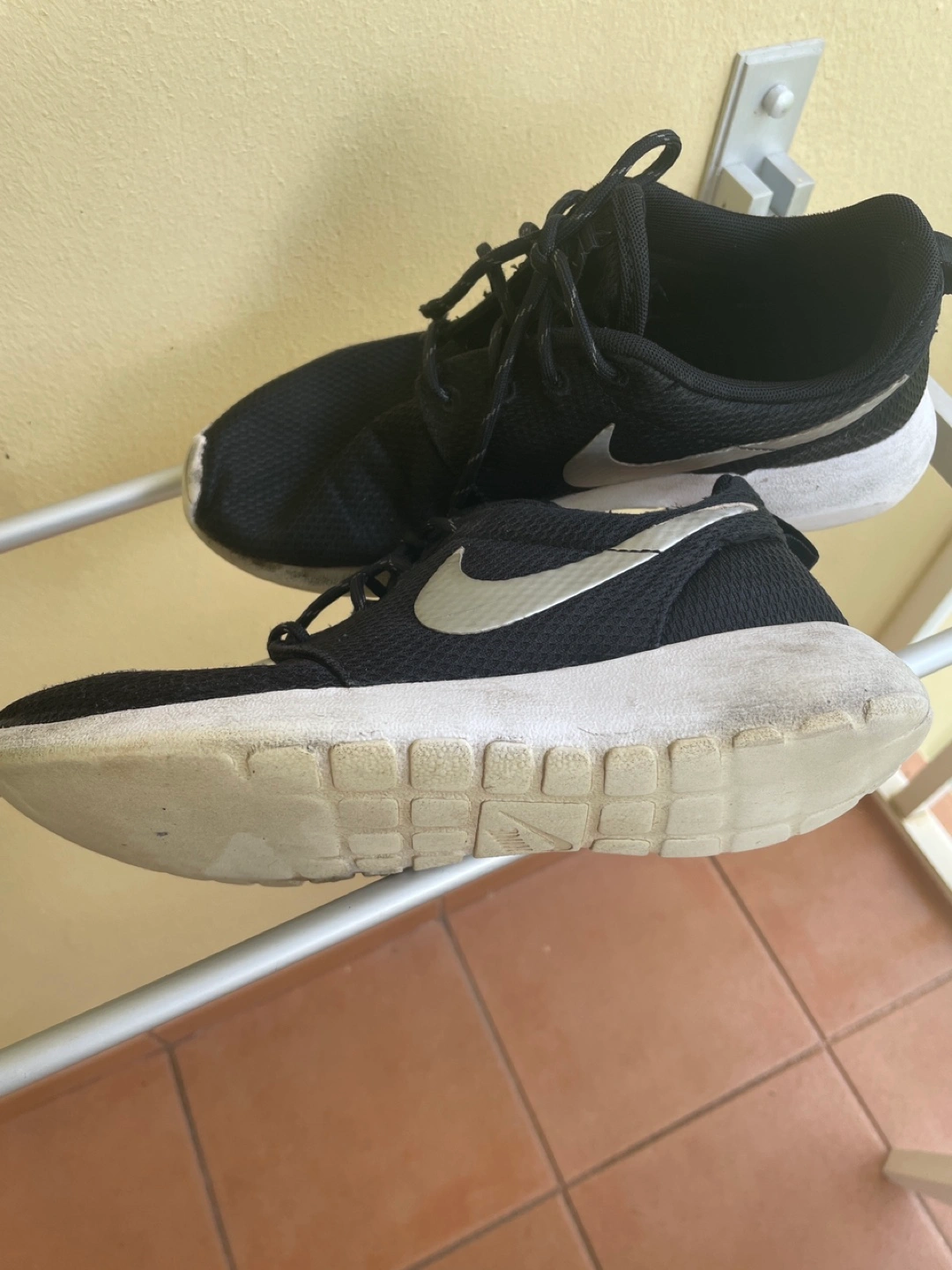 1000+Pre-owned Nike Roshe One running shoes. Black with silver swoosh. Good for everyday wear. Minor wear and tear.