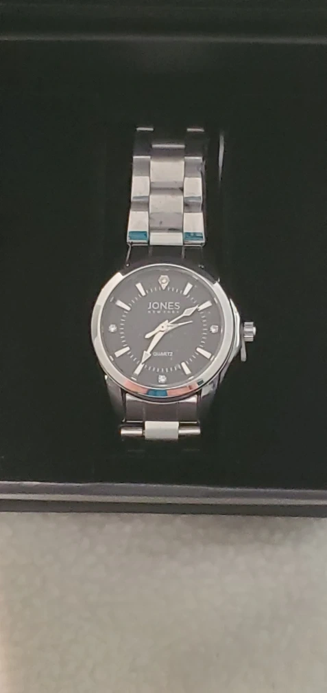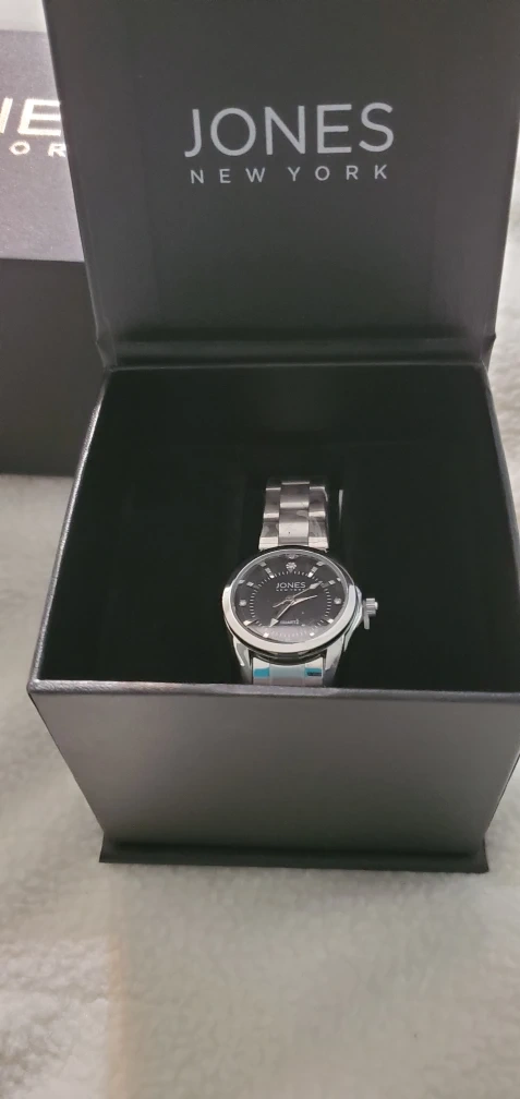 444Elegant women's watch. Silver stainless steel band. Black face with diamonds. Quartz movement. New in box.