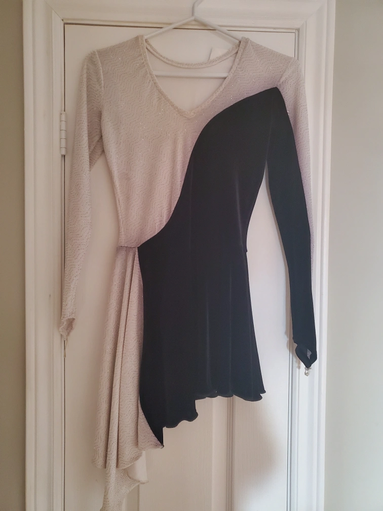 Girls figure skating dress. Two-toned design. White sparkly top and black velvet bottom. Long sleeves. Good used condition.