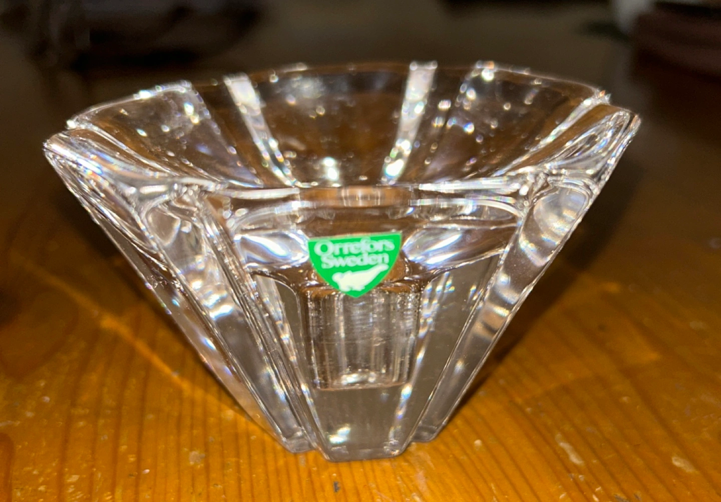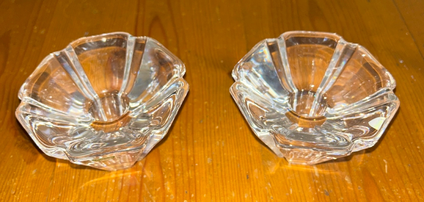 Two beautiful new crystal candle holders from Orrefors. Elegant addition to any home decor. 2 1/2” tall. Excellent condition. No chips or cracks.