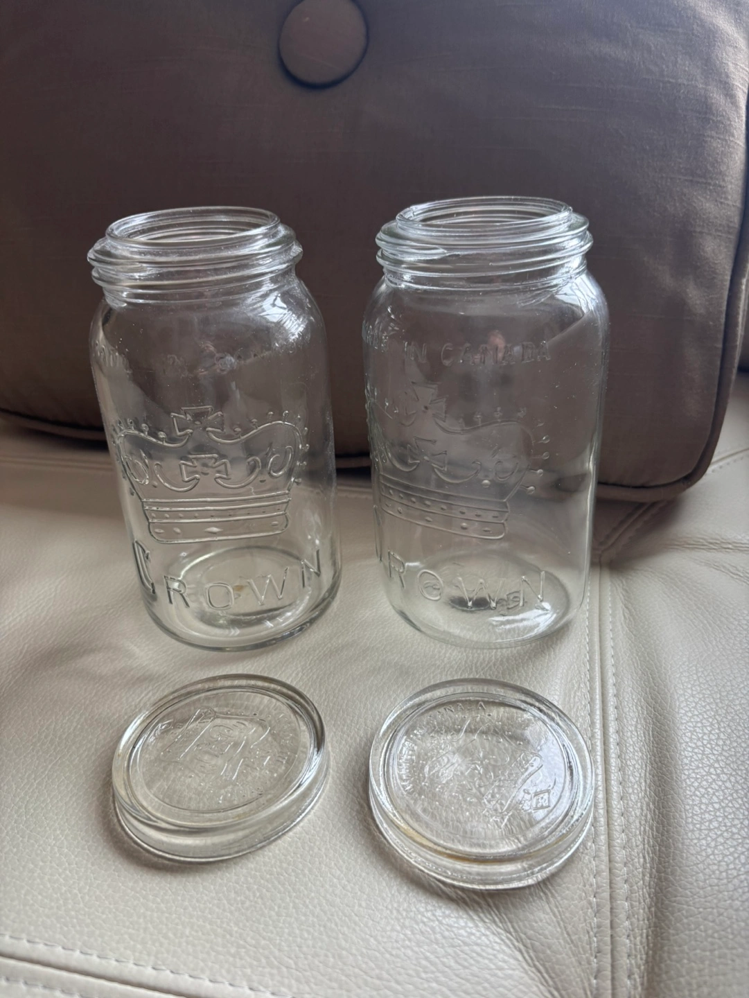 Pair of vintage large Crown brand glass jars. Made in Canada. Dates are 1939 and 1948 visible on bases. Includes glass lids but not the metal rings. In excellent condition. Can be sold separately but prefer to sell as pair. Pair for $25 or $15 each.