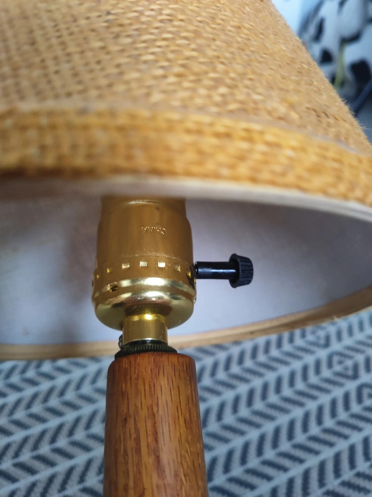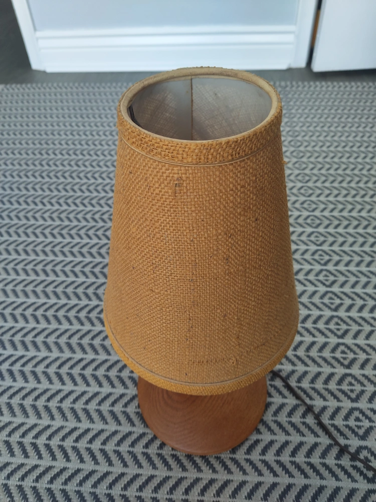 Vintage table lamp. Wooden base, burlap shade. Simple design. Great for a bedside table or desk. In good condition.