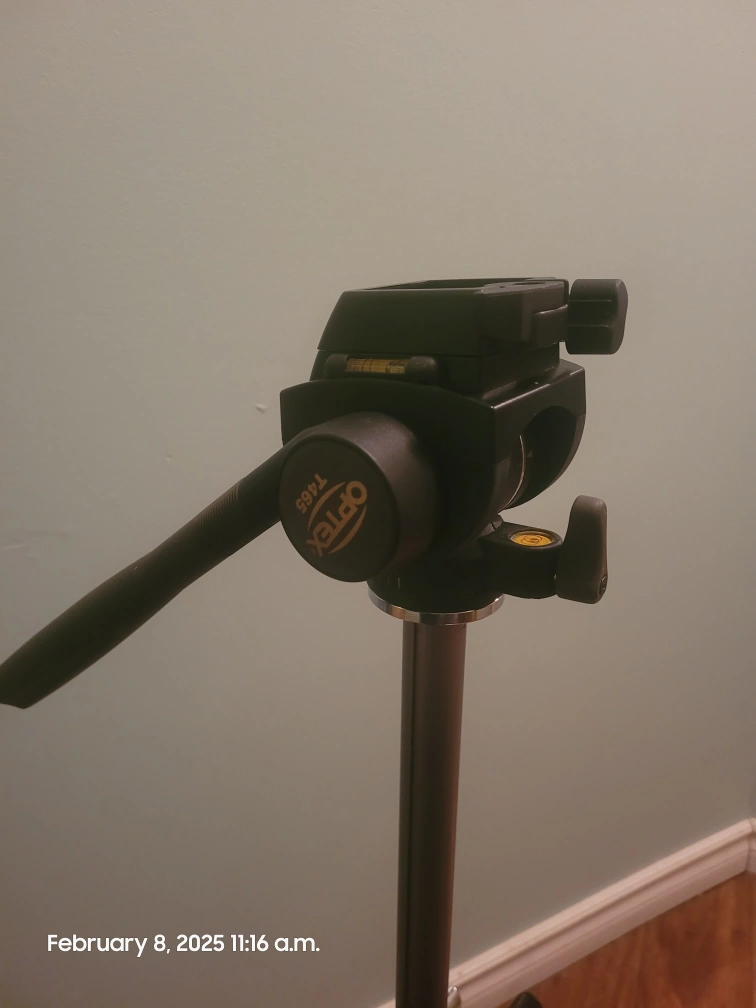 Optex T465 tripod, new in box. For photo video and digital cameras. Features adjustable legs and a fluid head. Lightweight and portable.