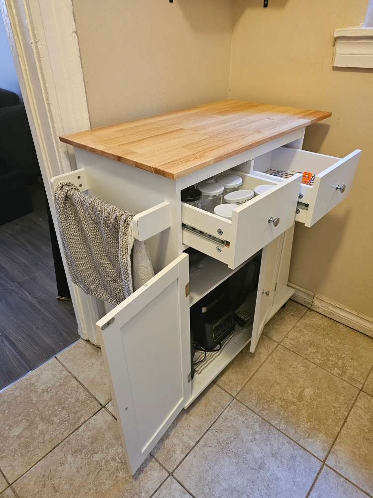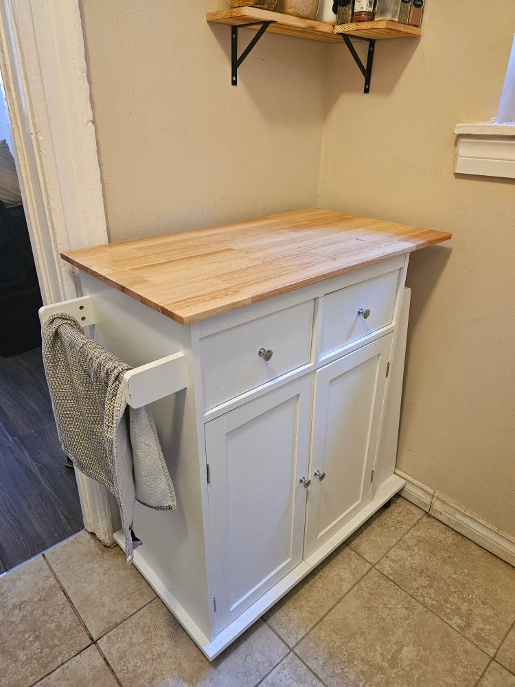 Rolling kitchen cart, white finish. Features butcher block countertop, two drawers, two cabinet doors, towel rack, and side storage. Great for small kitchens or extra counter space.