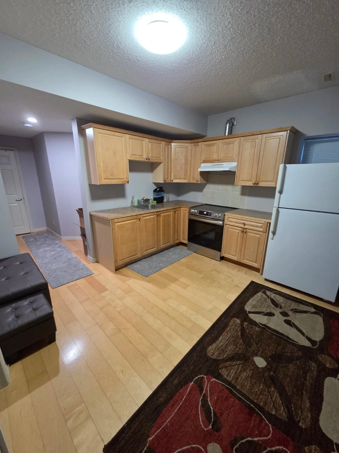Compact kitchen space with light wood cabinetry, a white refrigerator, and a stainless steel range. Includes a coffee table with seating in the adjacent living area. Good for smaller spaces or as a secondary kitchen area.