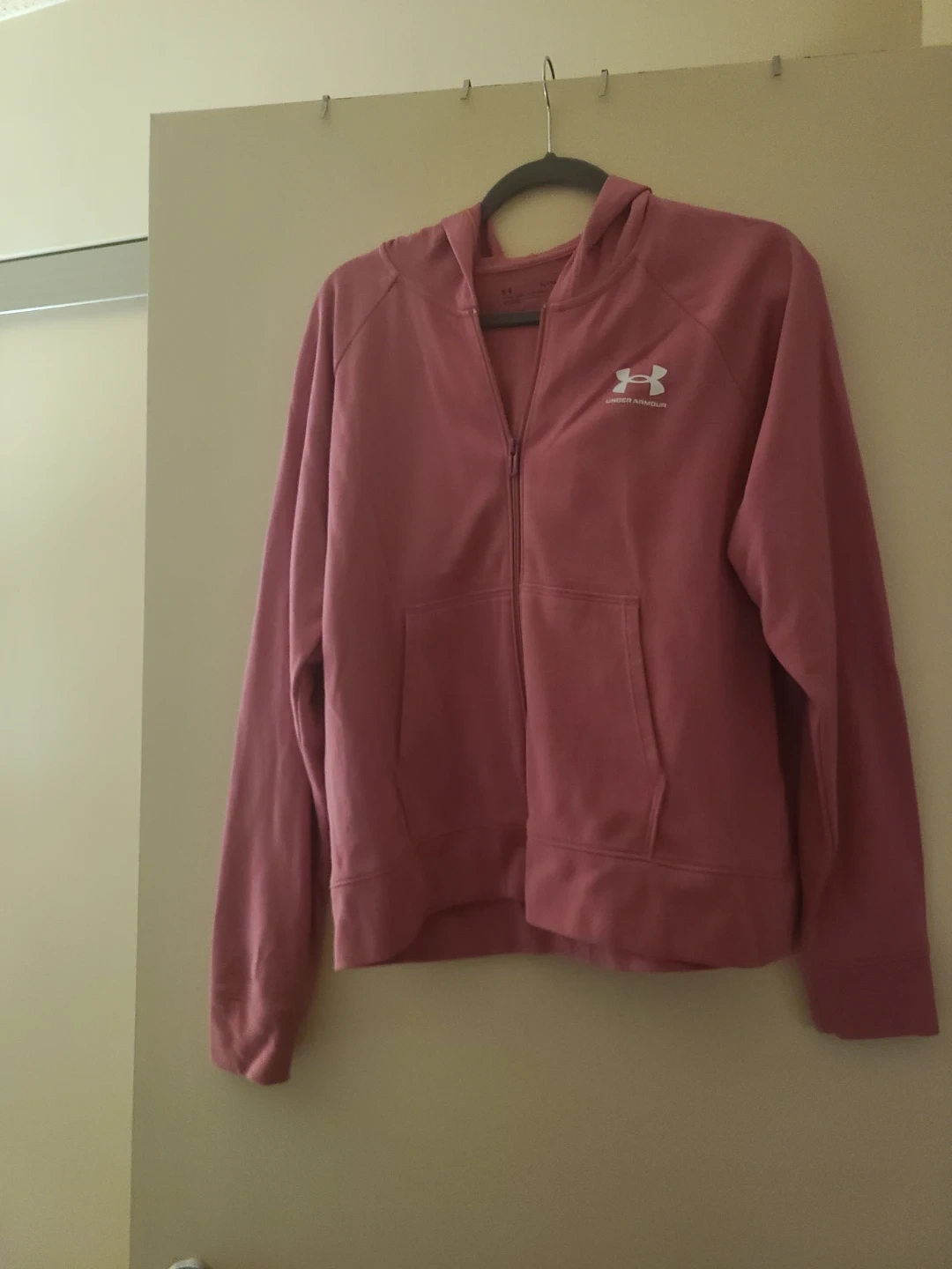 Here's a pink zip-up hoodie from Under Armour. It's in great condition and ready for a new owner! The size is XL but would probably also fit size large. Bought at the Under Armour store in Vegas.