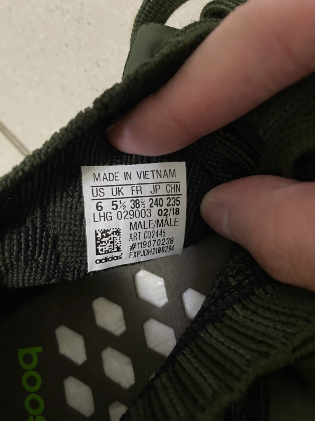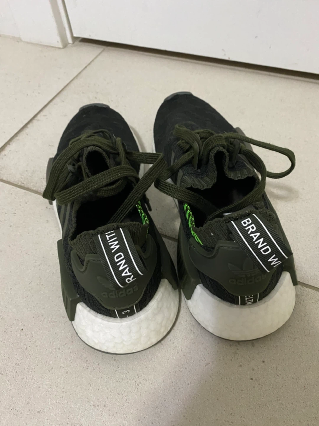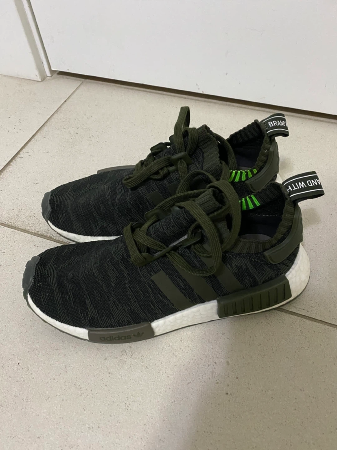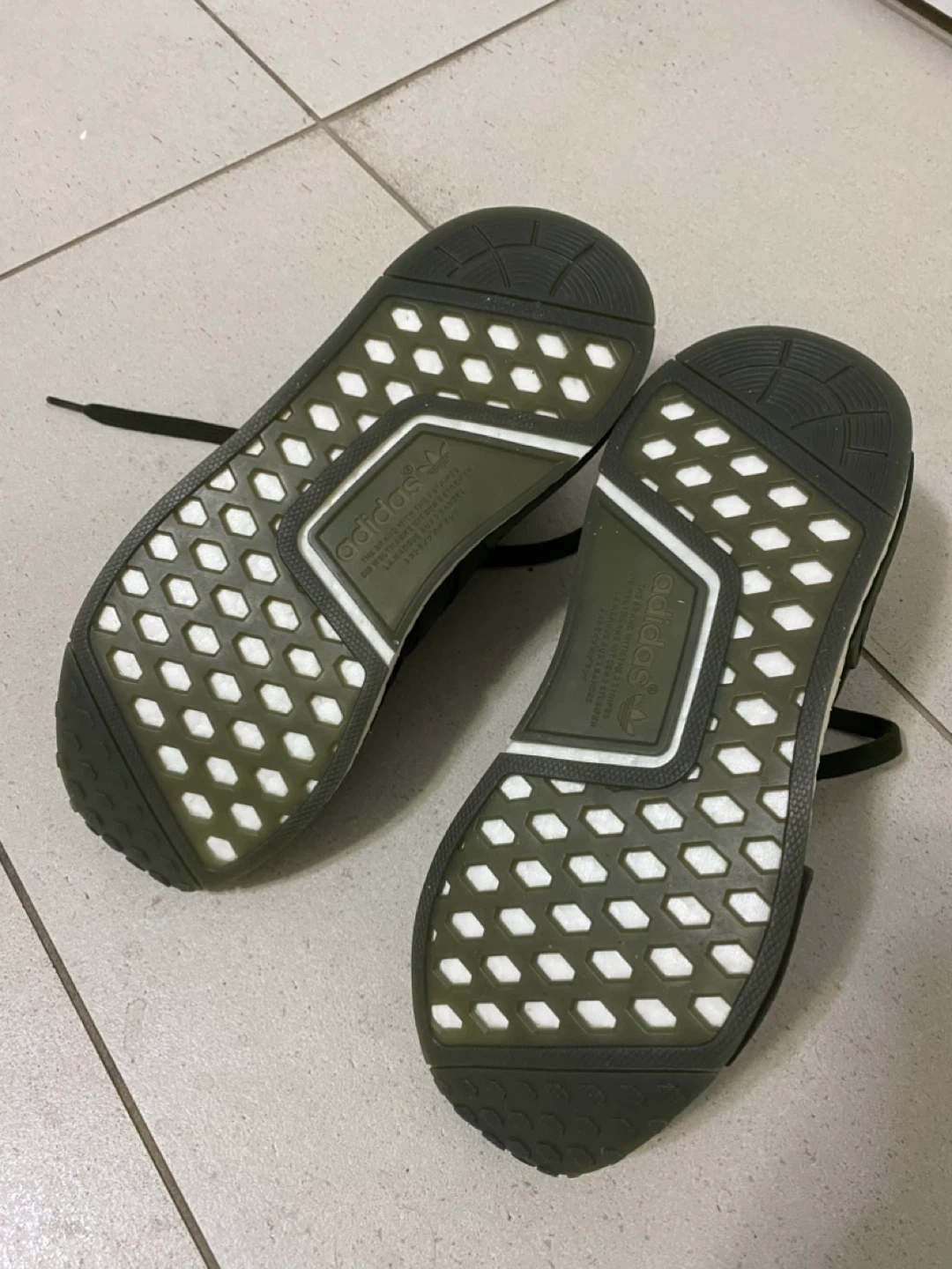 Adidas NMD R1 sneakers in an olive green colourway. Features the "Brand with the 3 Stripes" detail on the heel tabs. These are a men's size 6 US / 5.5 UK.