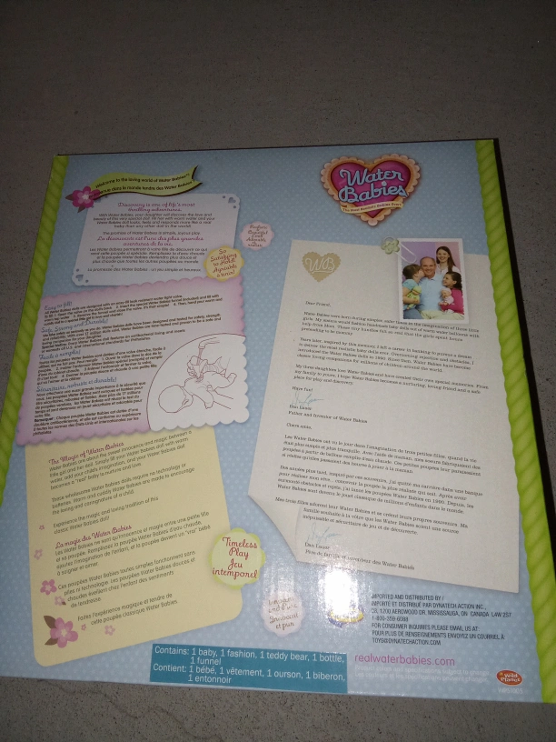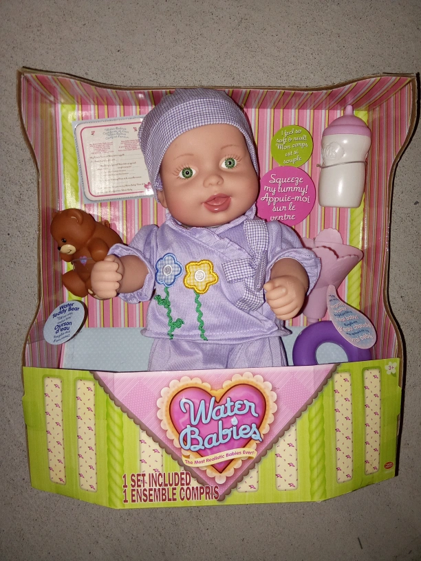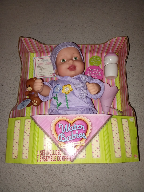 Adorable Water Babies doll. Includes bottle, teddy bear, and outfit. Great for imaginative play. New, in box.