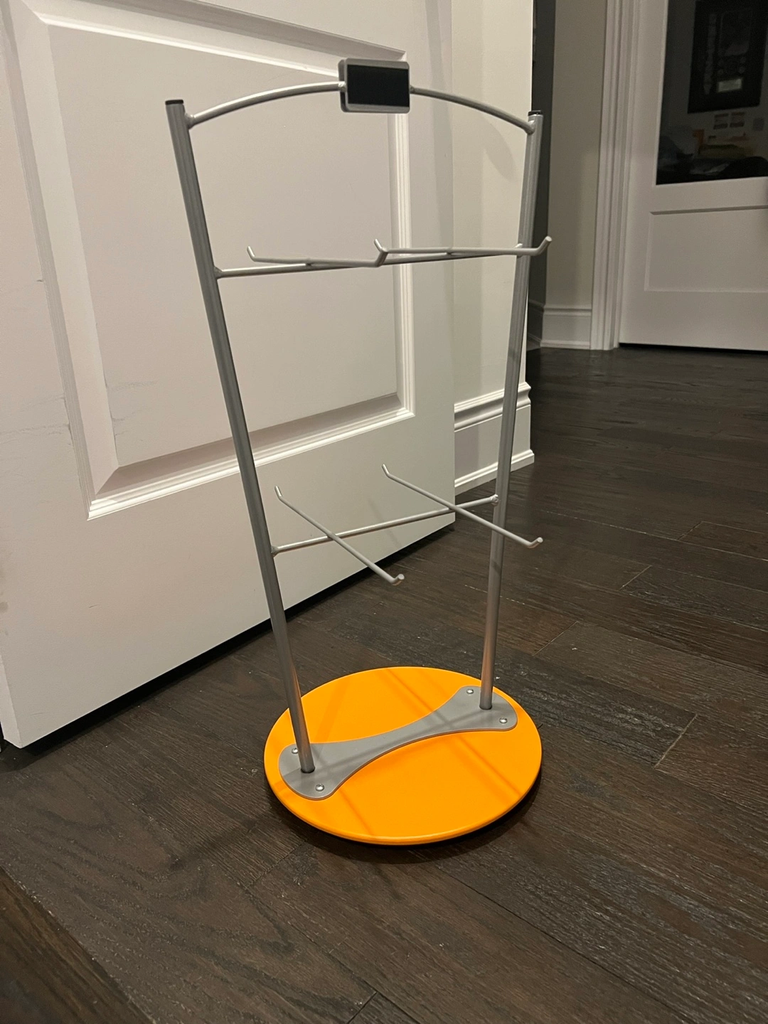 248Brand new in distributer shipping box. Silver metal stand with orange base. Multiple hooks for accessories. Rotates 360 degrees. Product/brand card holder at top. Image of rack showing hanging products is of an additional rack not the one listed here.