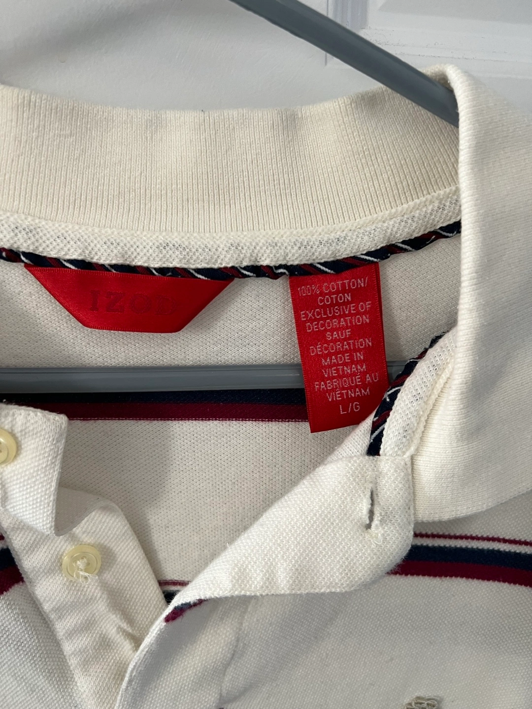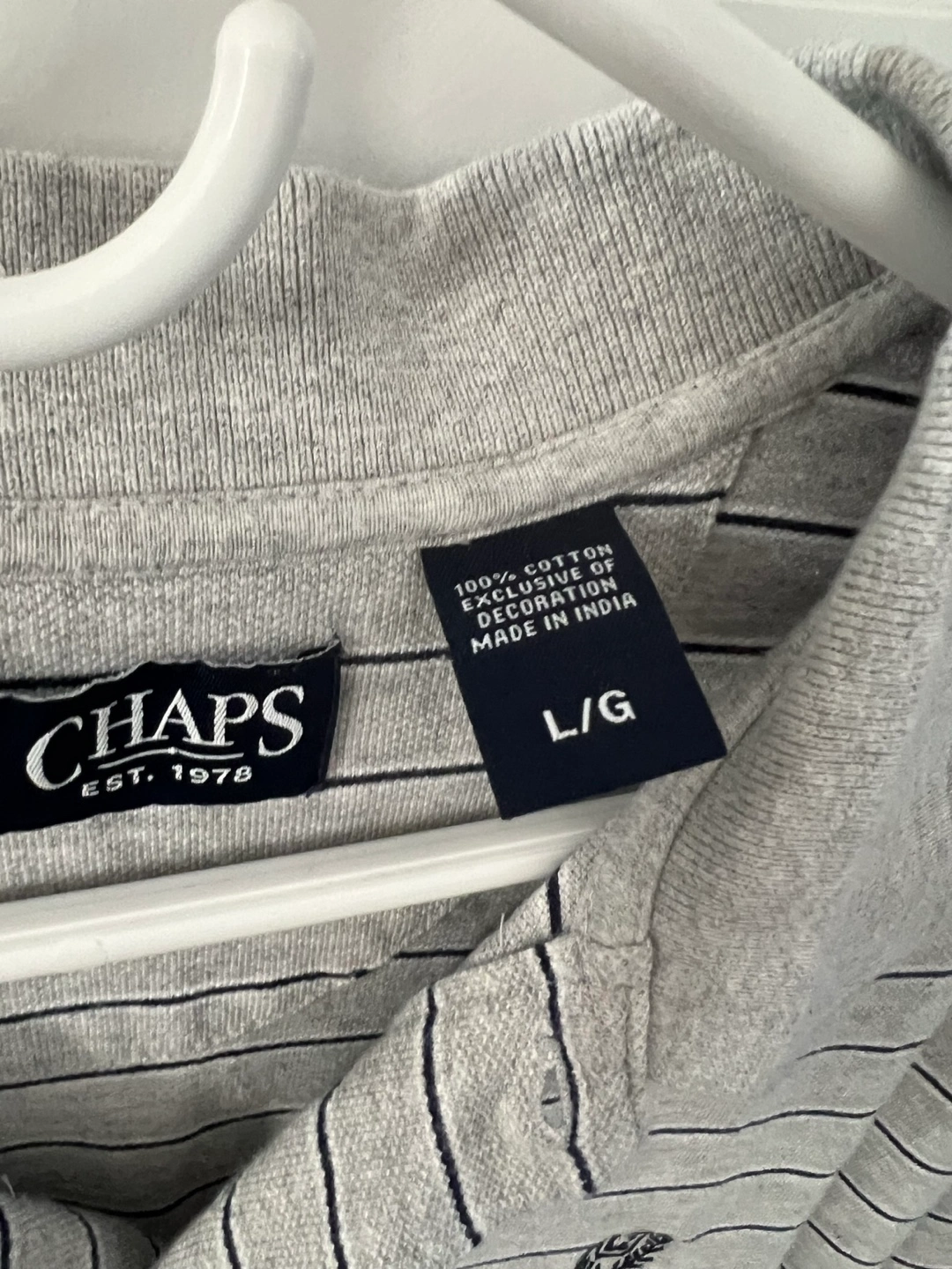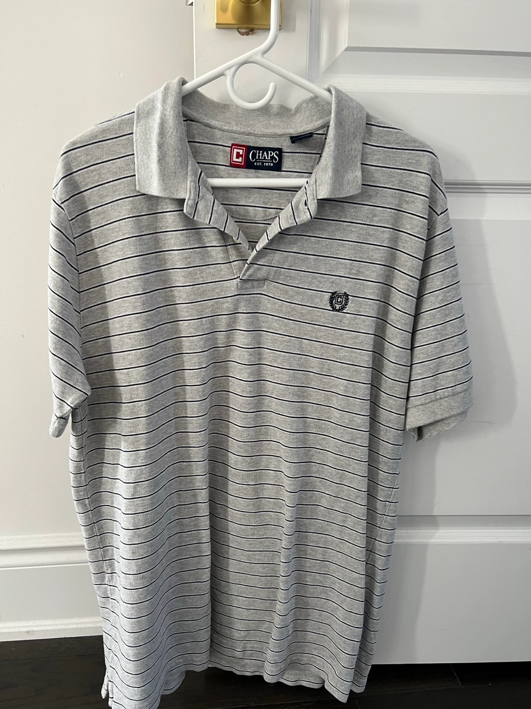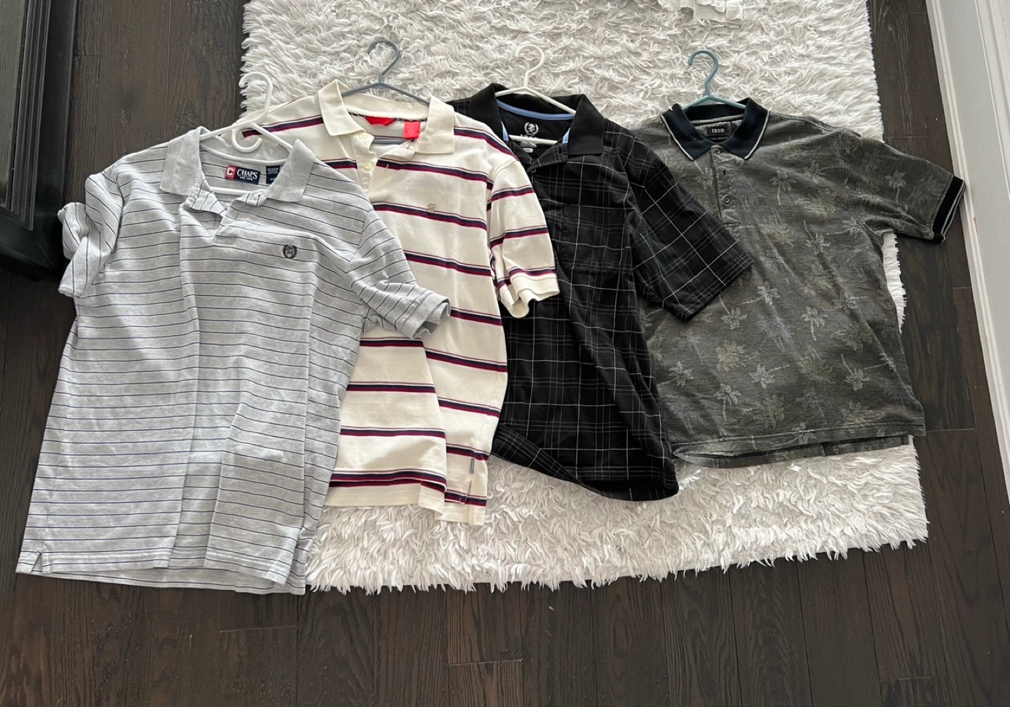 Bundle of four men's polo shirts. 3 are Size L and 1 Izod is M (but the fit seems to be a bit big). Includes one grey striped Chaps polo, one off-white and burgundy striped IZOD polo, and two additional grey/black patterned polos. Good condition.