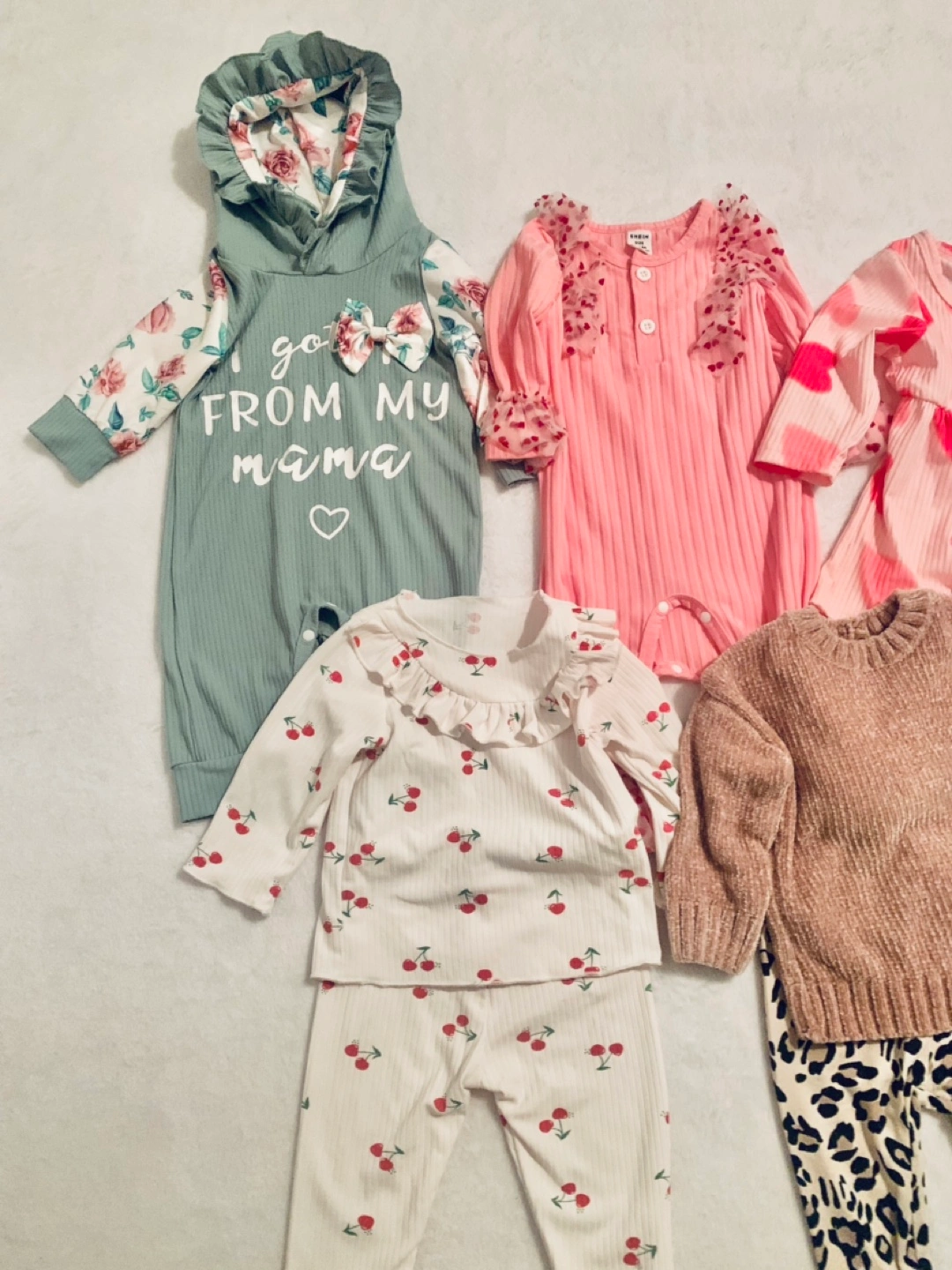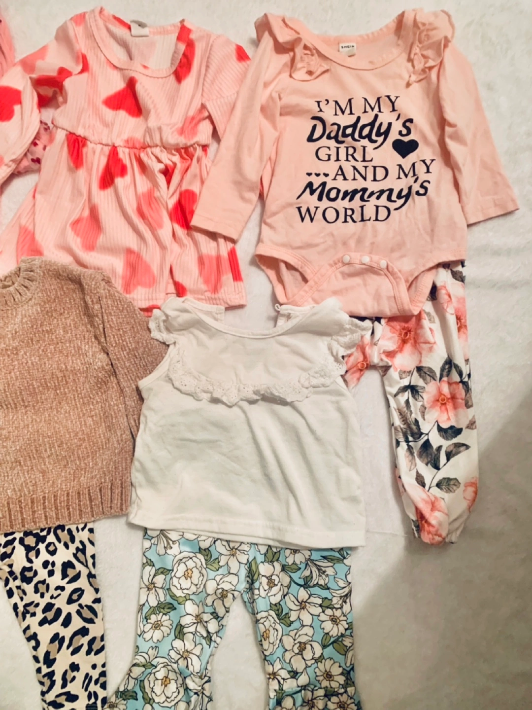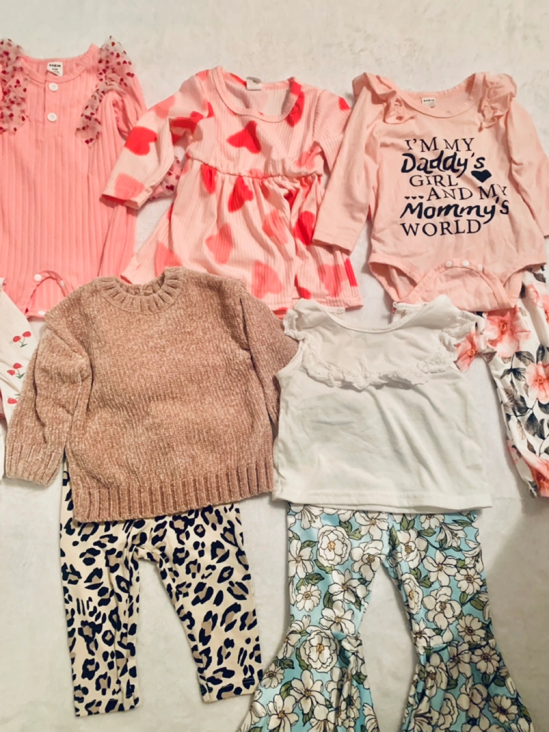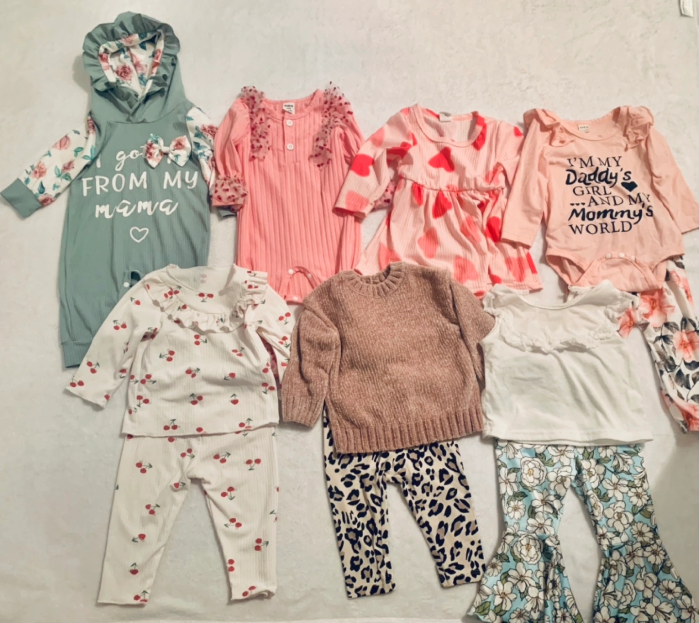 Adorable baby girl clothing bundle. Includes bodysuits, dresses, leggings, and sweaters. Various colours and patterns. Perfect for your little one. For fall or winter weather. Size 3-6 months. Take all for $25 or $3 each