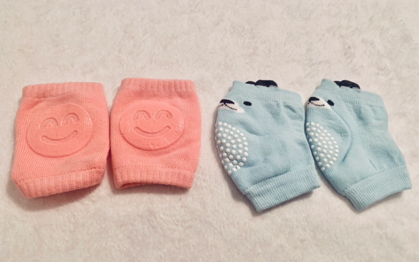 Adorable set of baby knee pads. Pink pair features smiling face design. Light blue pair features cute animal faces. Soft and comfortable material. Perfect for protecting little knees while crawling or learning to walk. Take all for $5 or $3 each
