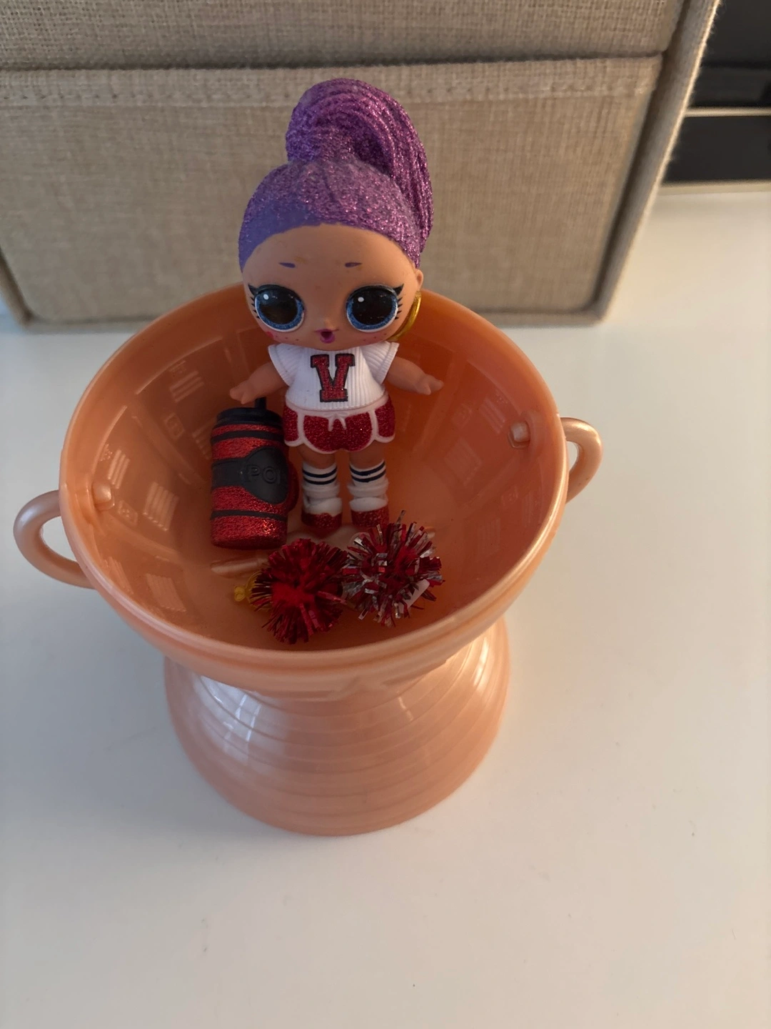 Mini LOL doll. Purple hair, cheerleader outfit. Accessories included: water bottle, pom-poms. Comes in a small trophy-shaped container.