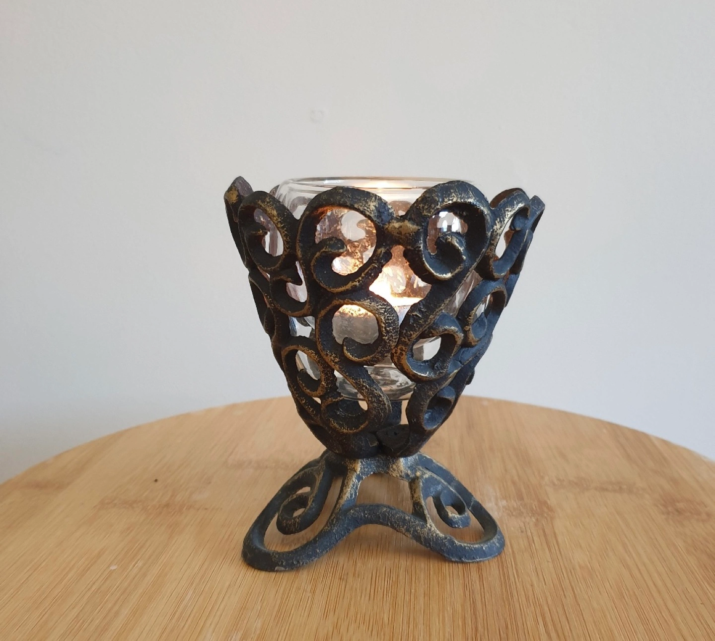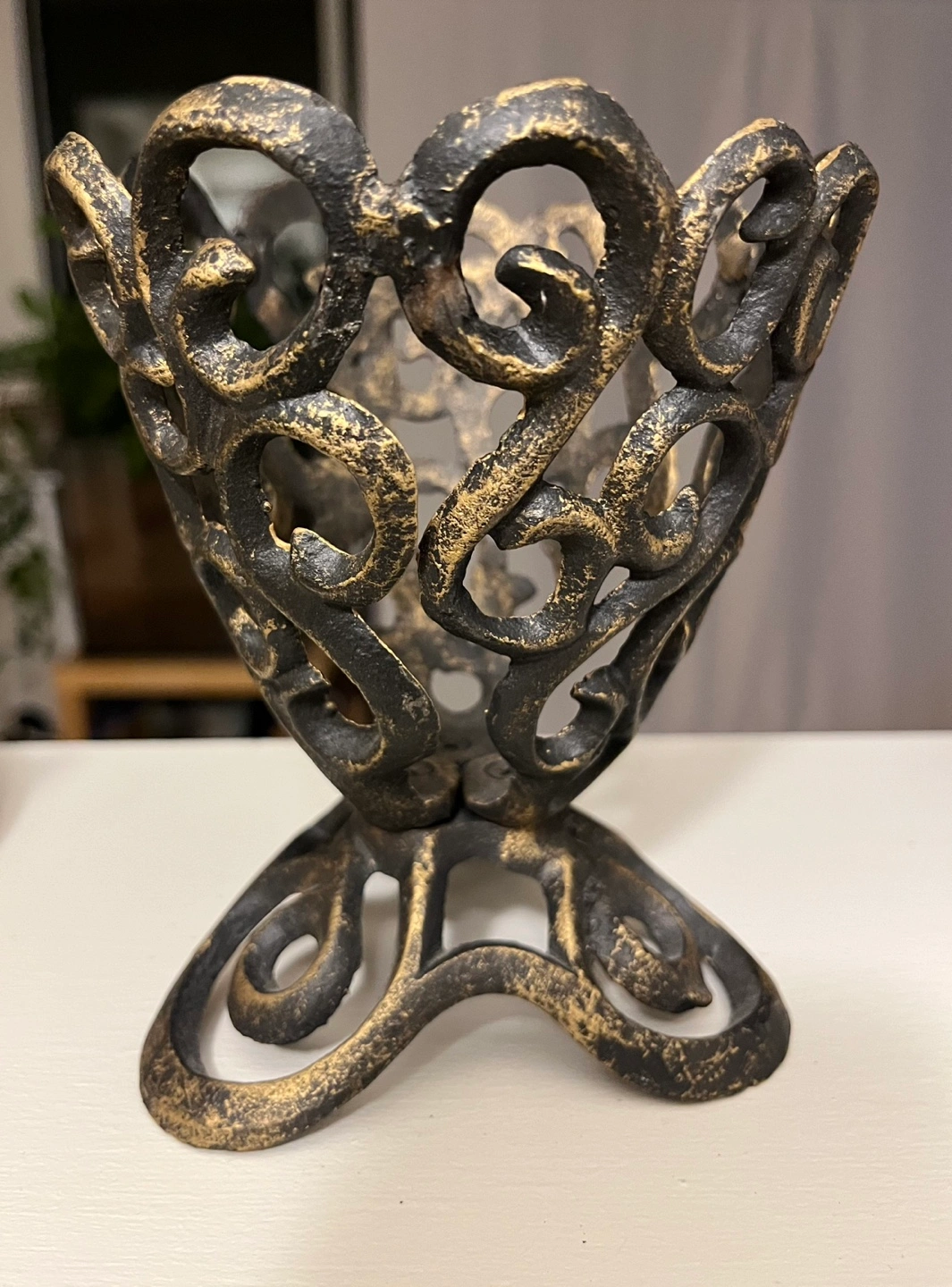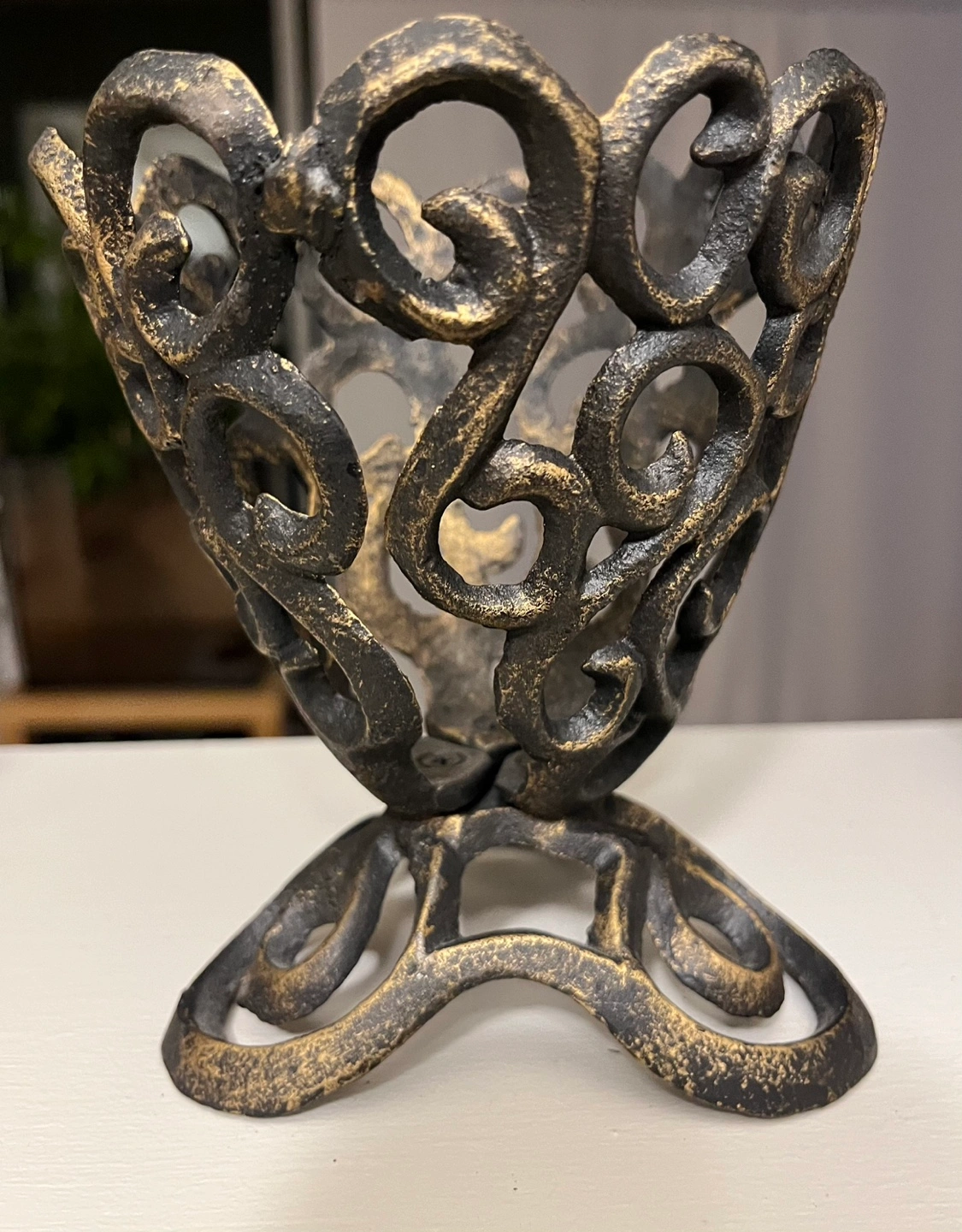 Small decorative metal brass planter or candle holder. Features an intricate, swirling design. Dark bronze/black finish. Sturdy base.