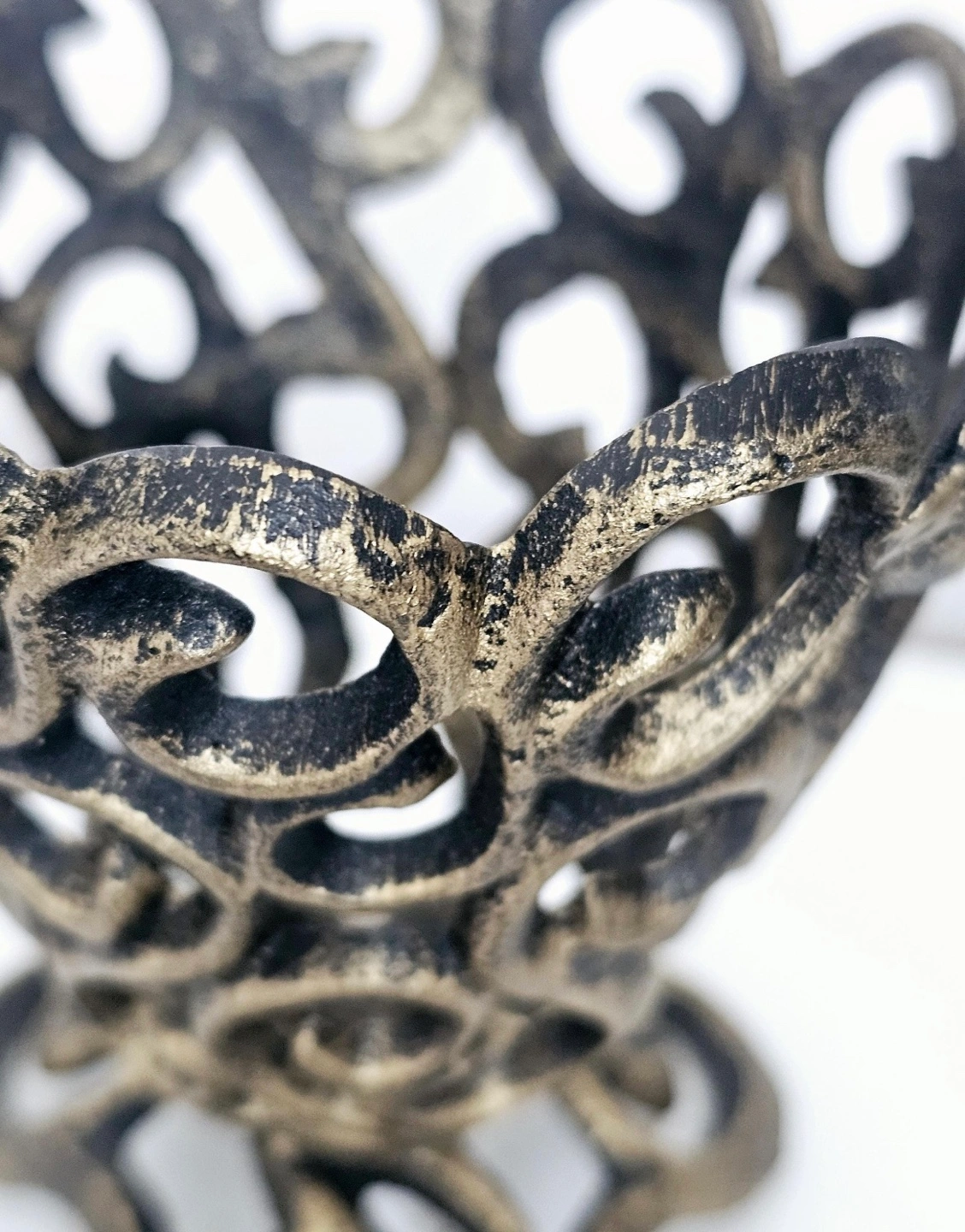 Add elegance to your kitchen or living room with this magnificent antique-style openwork brass bowl. Use it as a storage compartment or as a unique decorative object. Its patina will add a touch of rustic charm to any space.