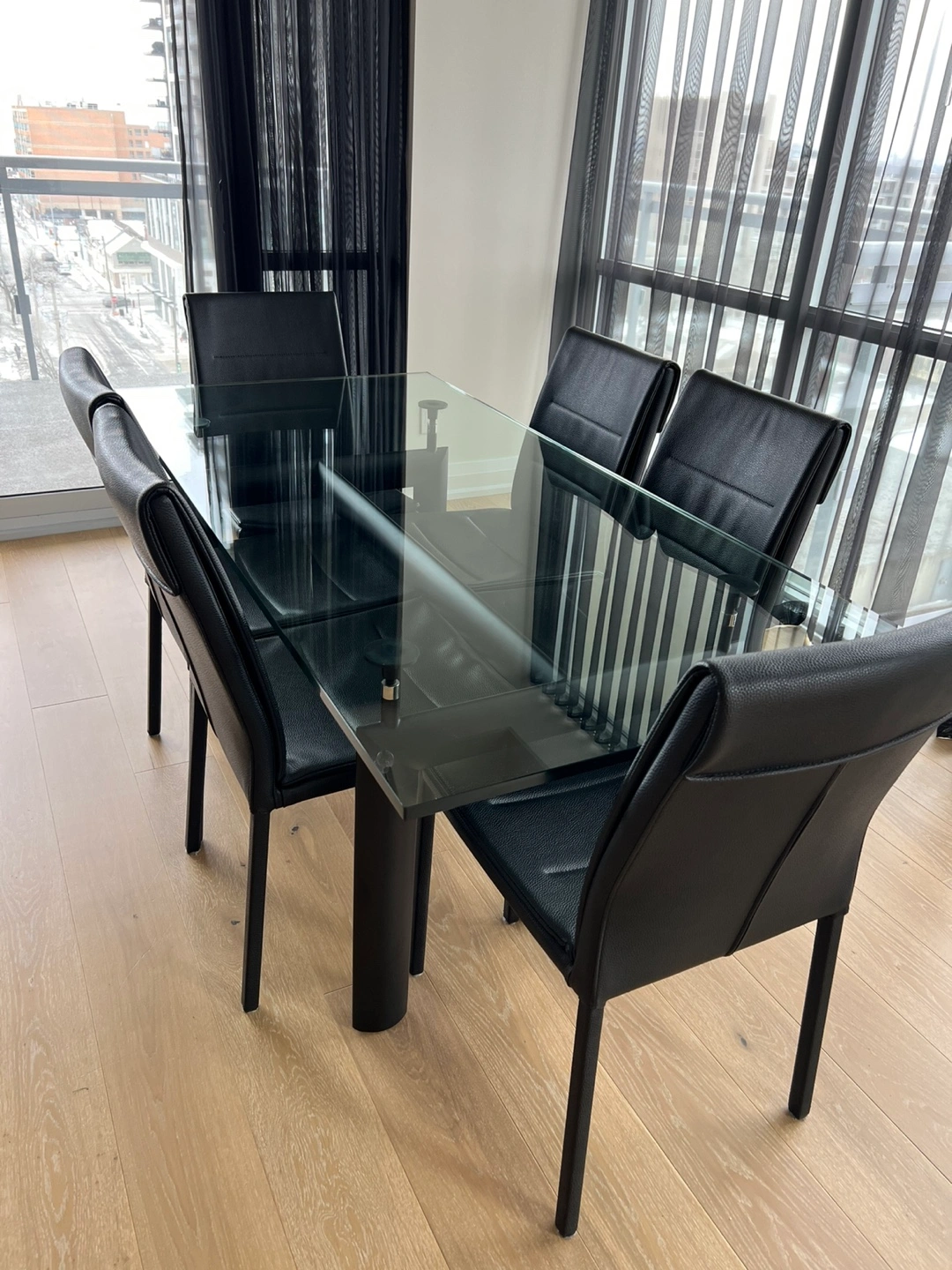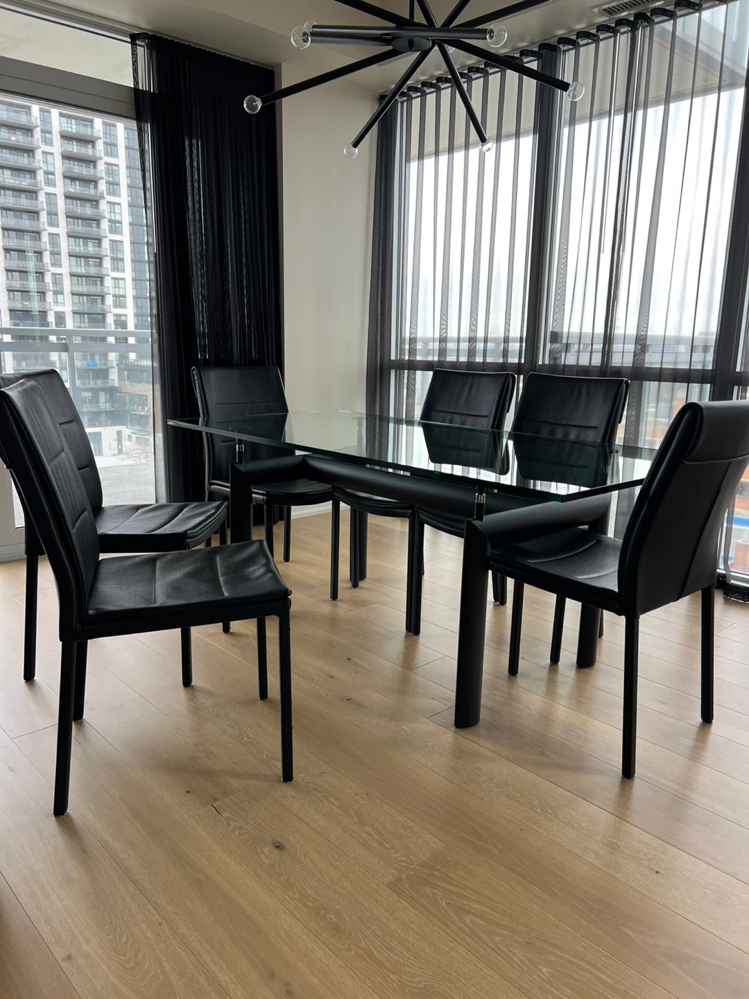 Corbusier inspired sleek glass-top dining table. Six coordinating black leather chairs. Contemporary design. Perfect for a modern dining space. Minimalist style.