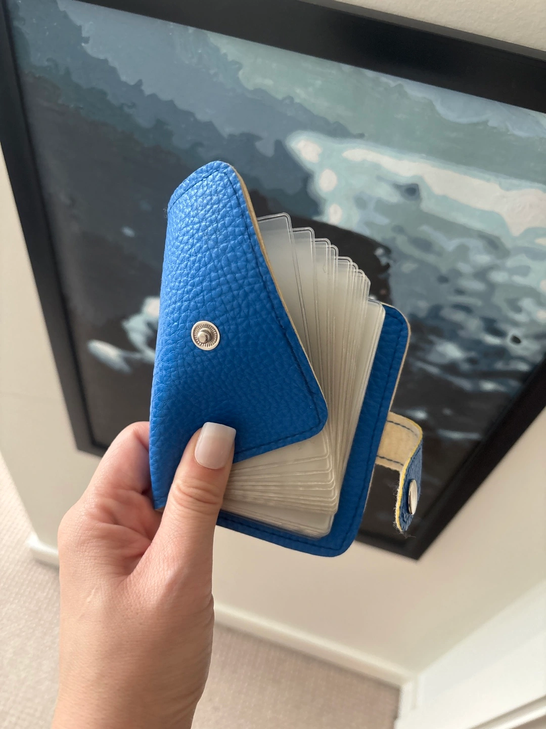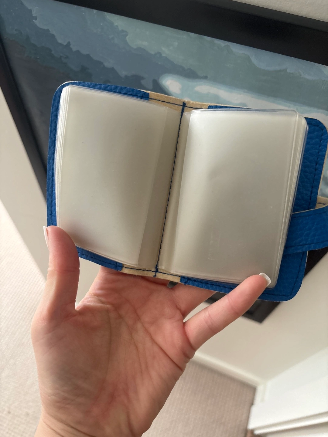 Small blue leatherette card holder. Multiple clear plastic sleeves for cards. Snap closure. Compact and portable.