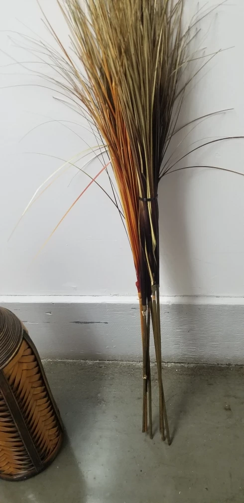 Tall woven vase. Features a unique orange and brown design. Includes dried floral arrangement. Perfect home decor accent.